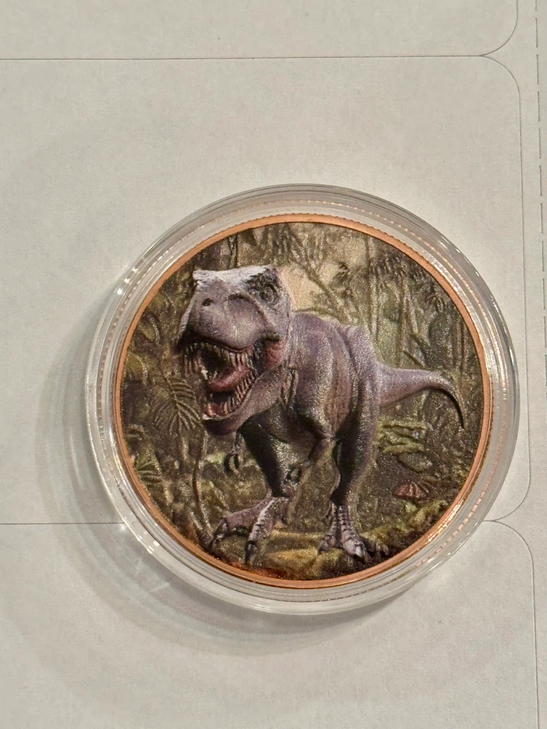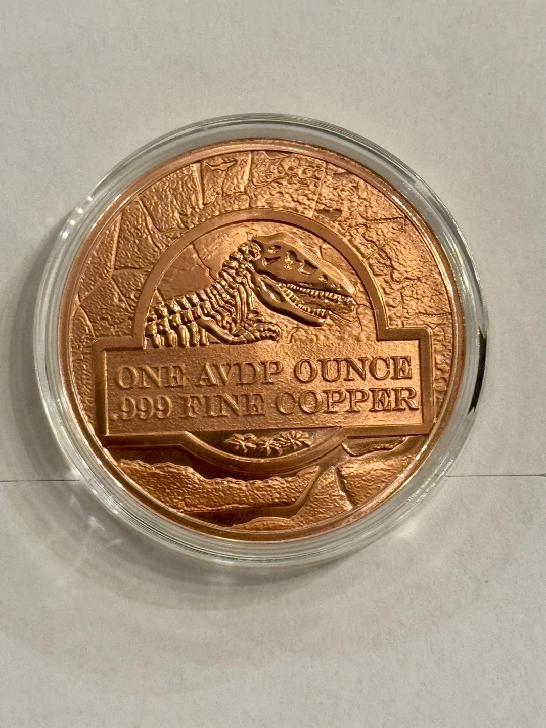 This 999 fine copper round features a detailed dinosaur T-rex design on one side and a fossilized skeleton on the other. It weighs one AVDP ounce. A neat addition for collectors!