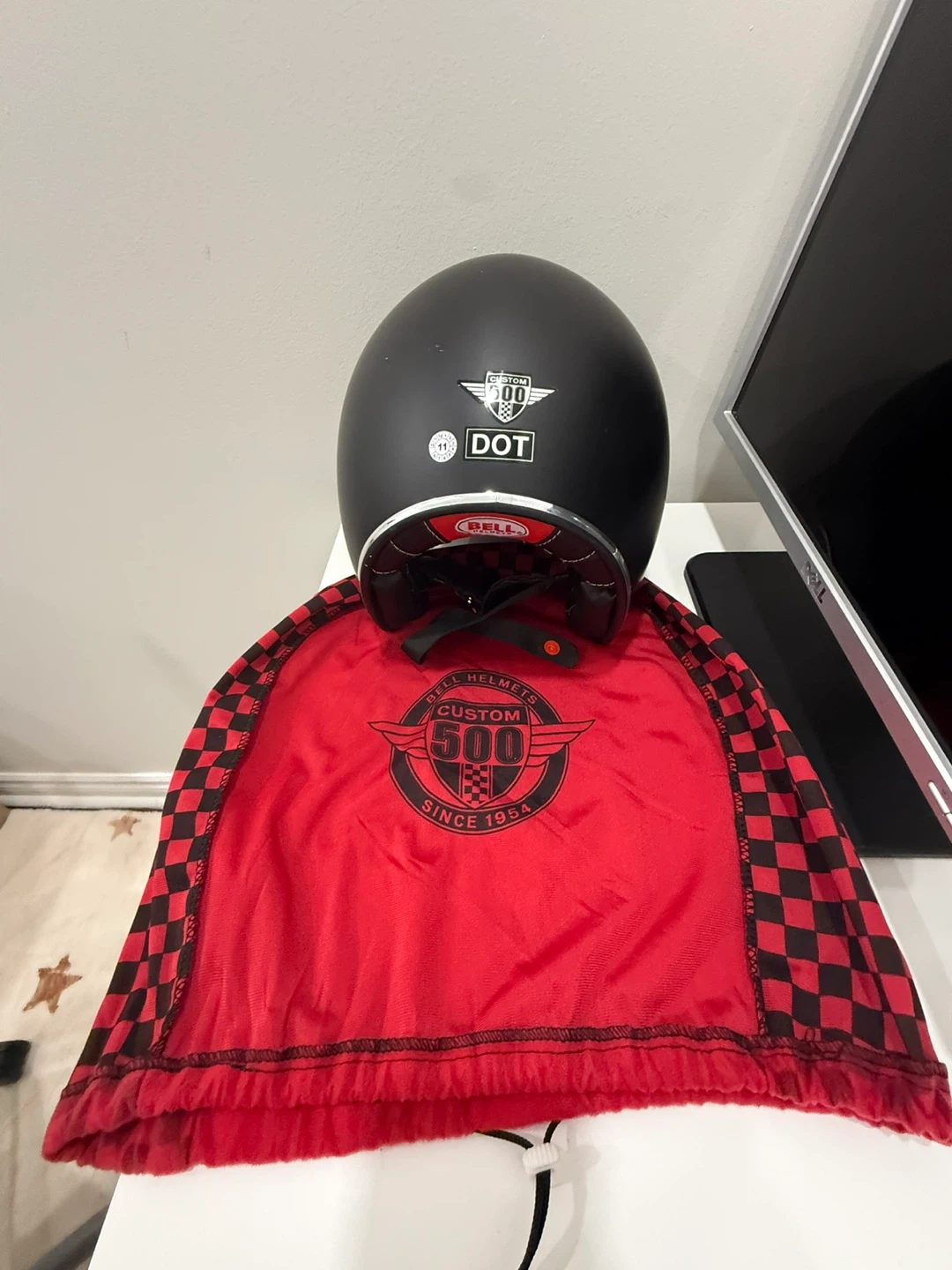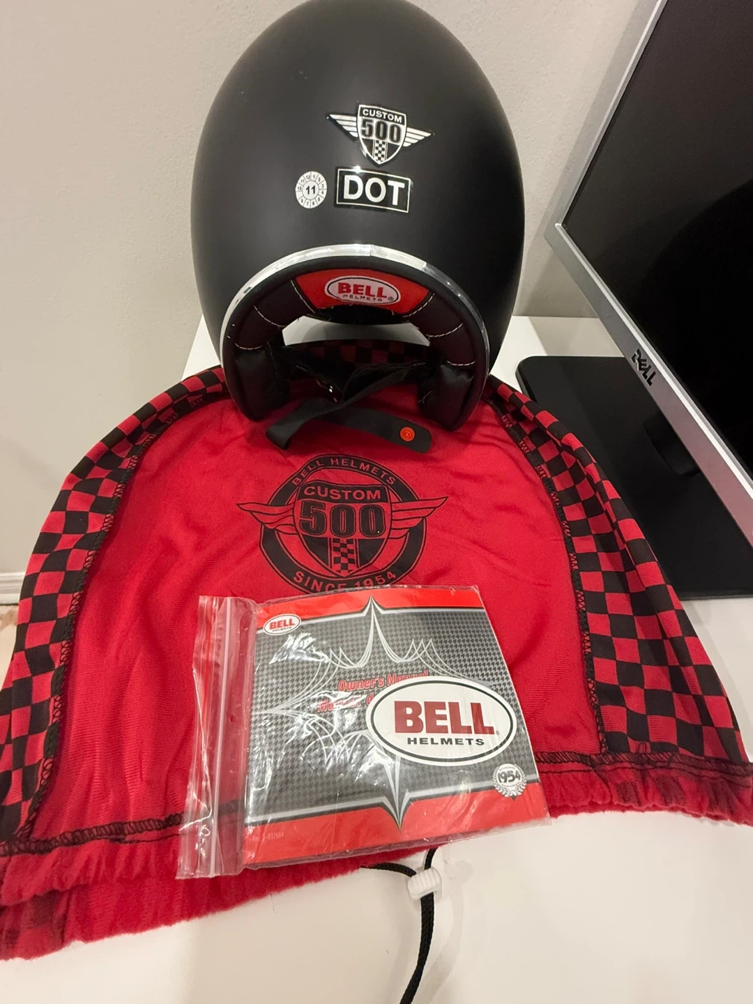 This is a matte black Bell Helmets Custom 500 motorcycle helmet. It's DOT approved and includes a red checkered helmet bag. This helmet's classic design is great for riders seeking both style and safety