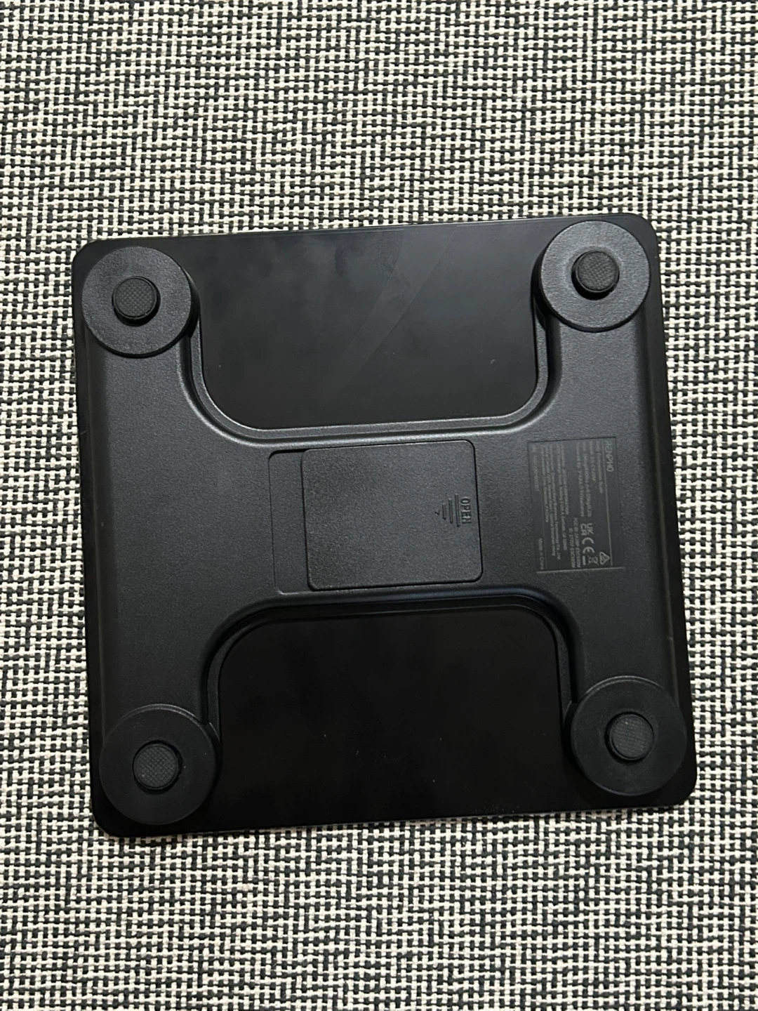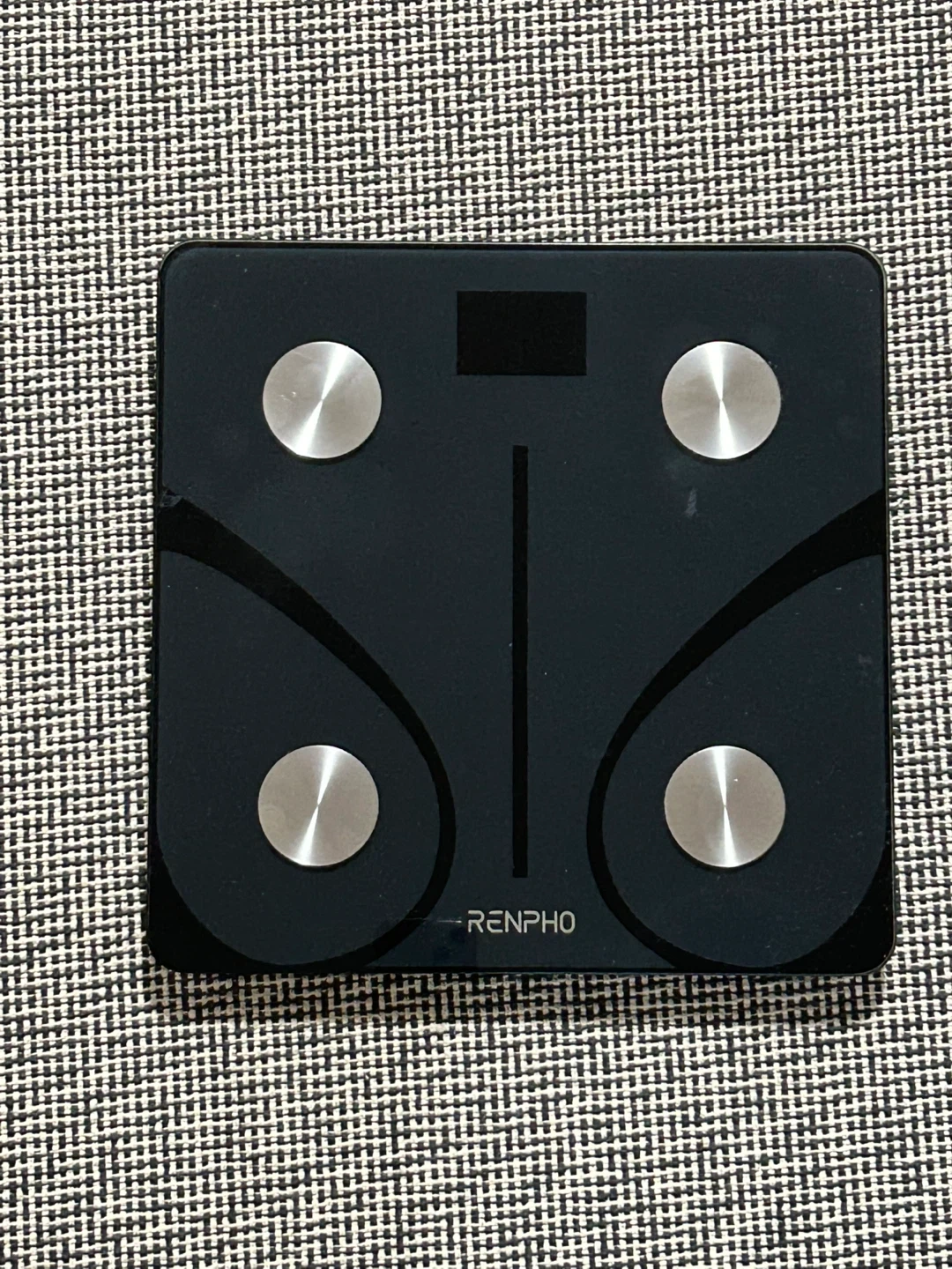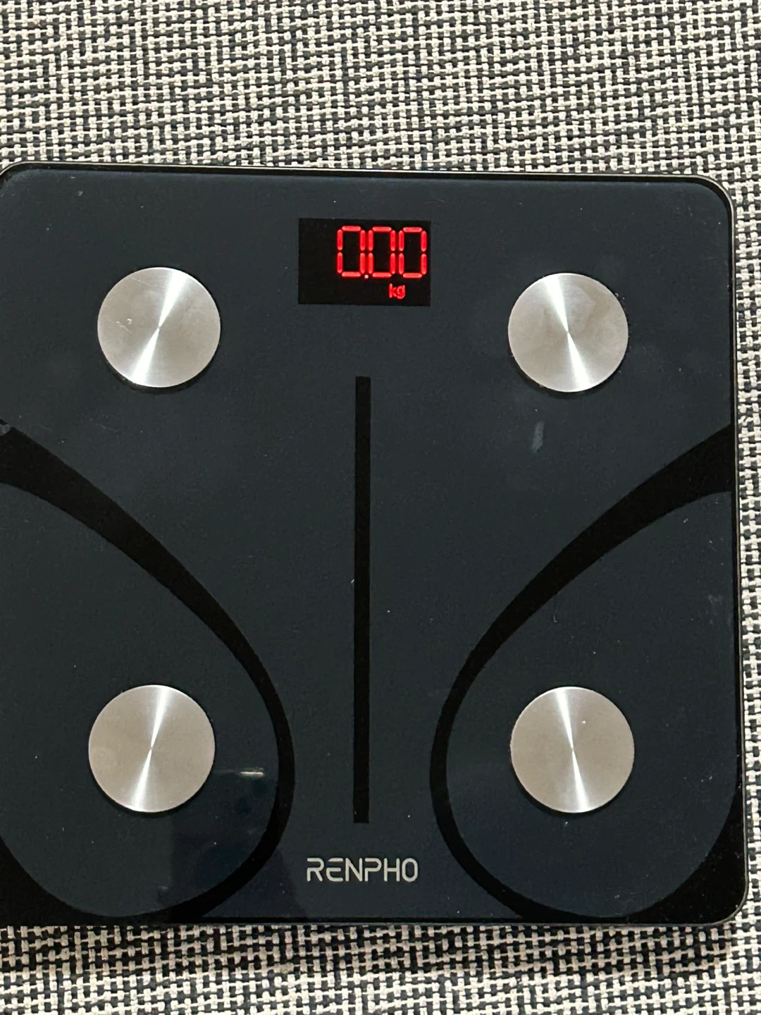 This Renpho digital scale is black and has a sleek design. It displays weight in kg and has four metal contact points. It's powered by batteries and made of durable materials.