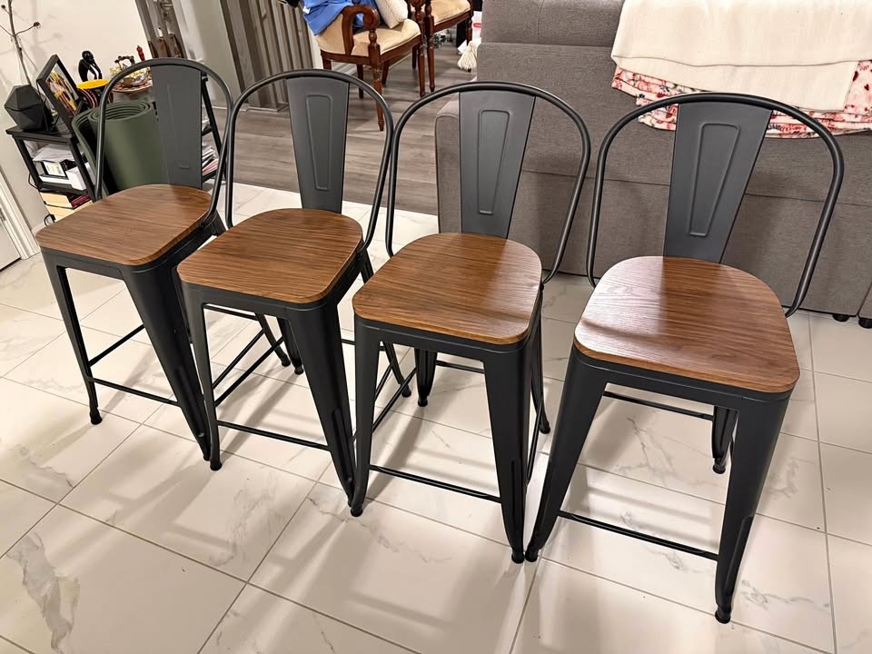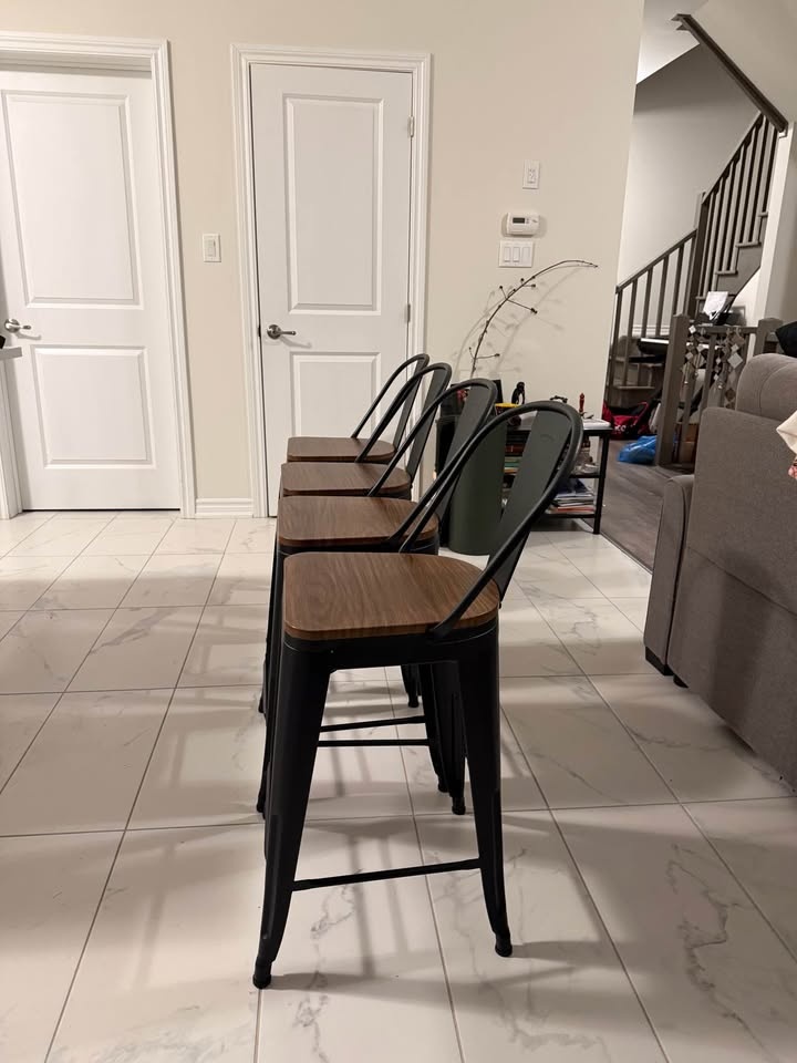 Selling a set of 4 stylish barstool chairs in excellent condition. They have a solid metal frame that is sturdy with no wobble, and comfortable wooden seats. These chairs have a modern/industrial look and would fit well in kitchens, islands, or home bars. Let me know if you're interested!