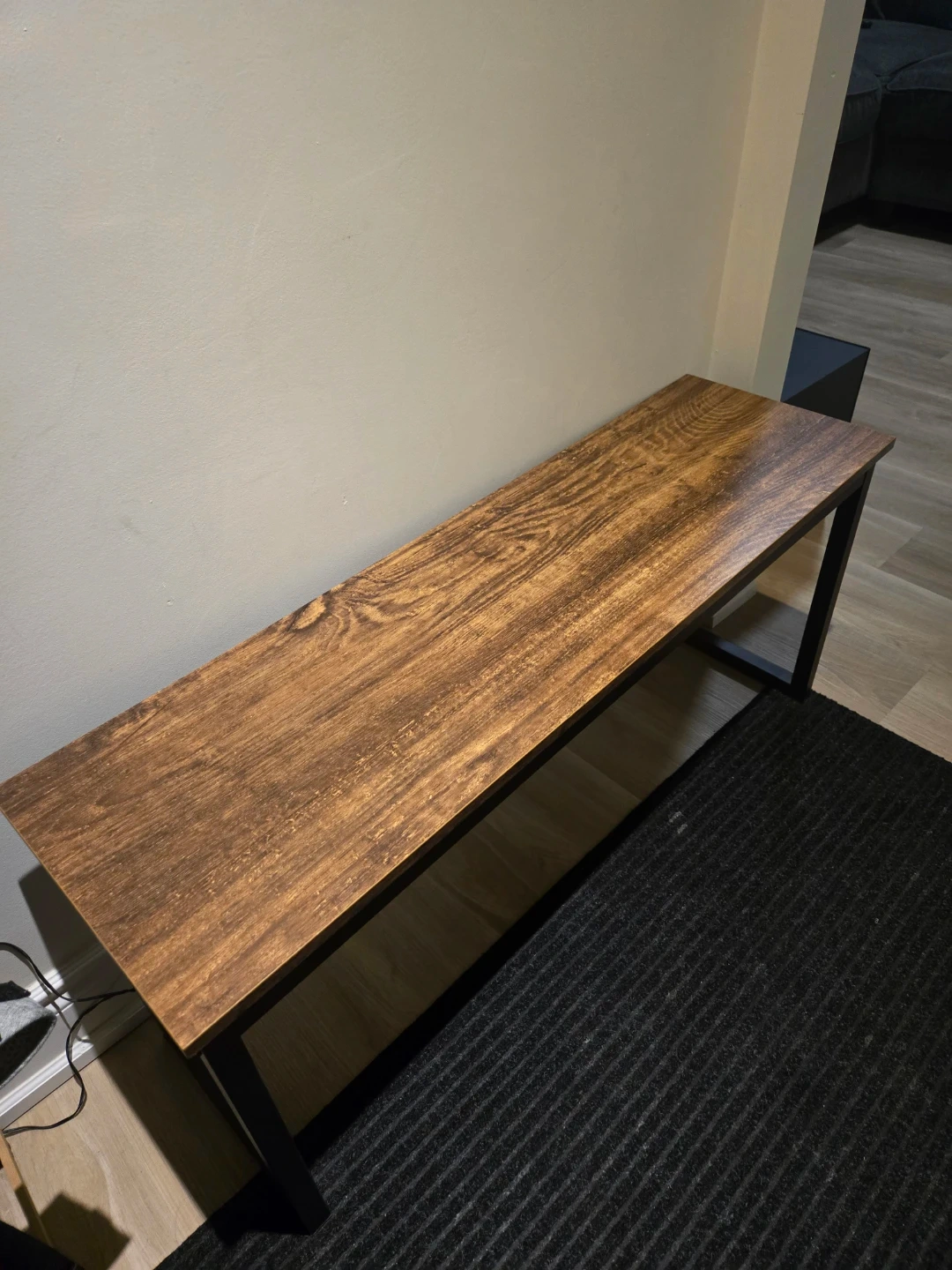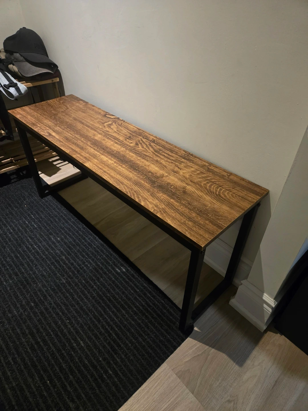 This bench features a rustic wood-look tabletop with a sturdy black metal frame.