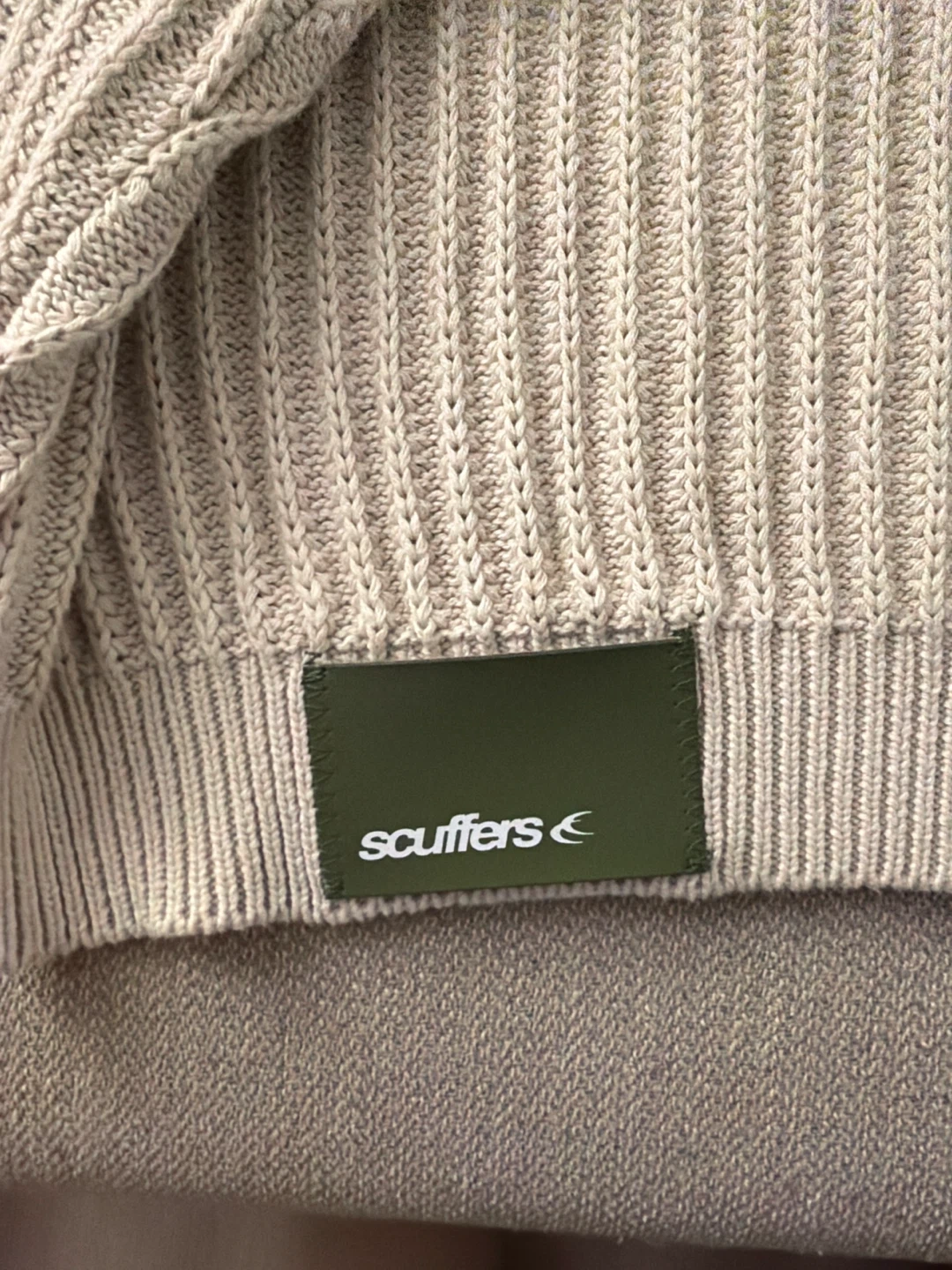 A cream-coloured ribbed sweater from Scuffers. It features a camouflage logo on the back. Large size, slightly cropped length. Never used