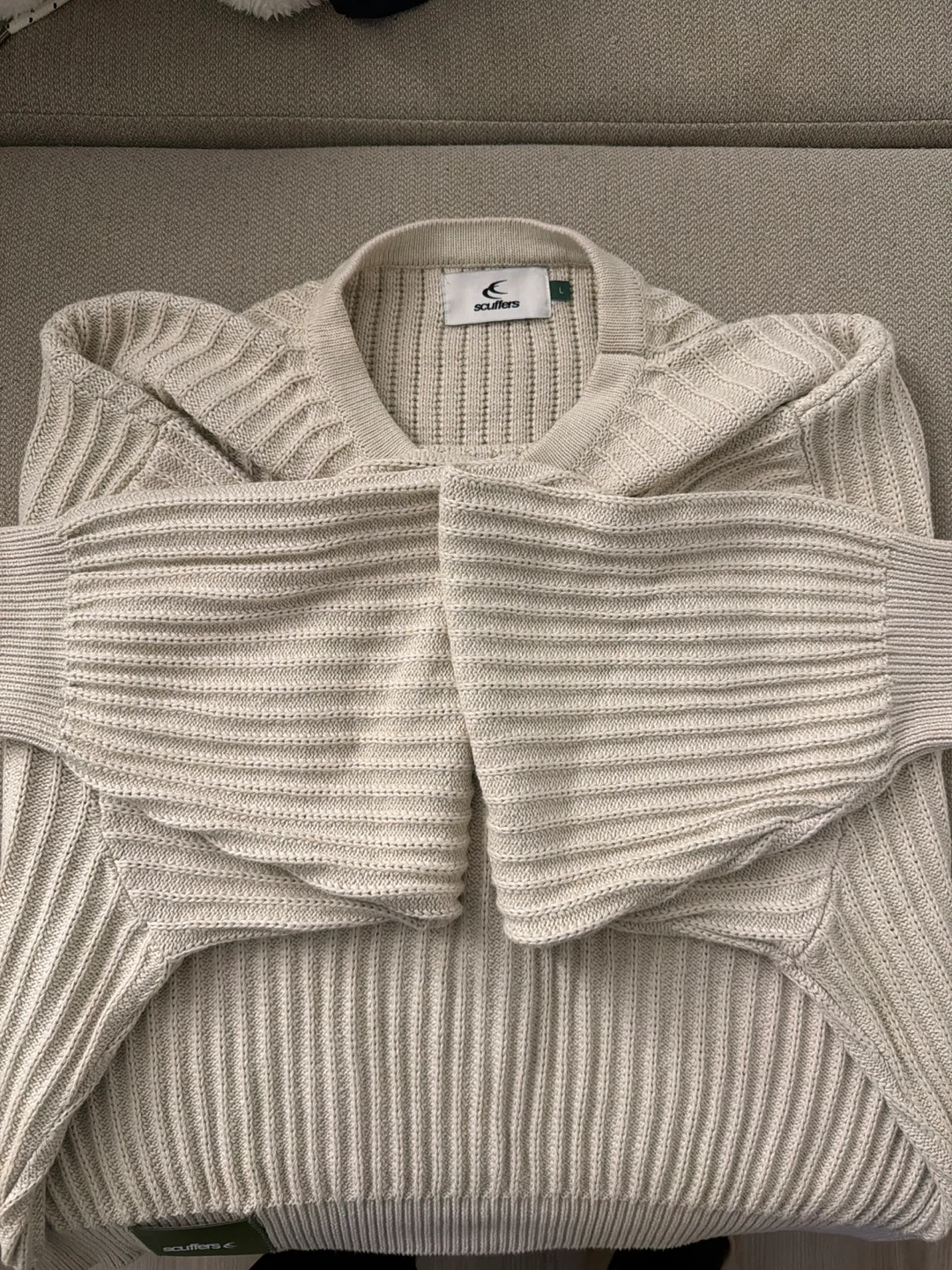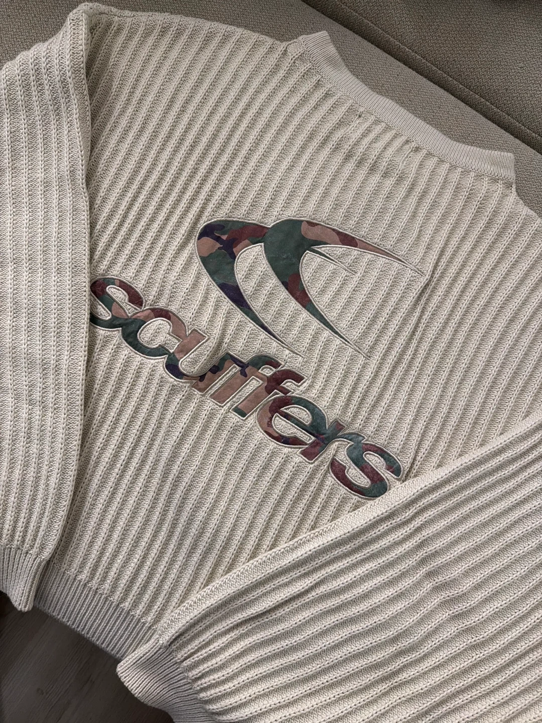 A cream-coloured ribbed sweater from Scuffers. It features a camouflage logo on the back. Large size, slightly cropped length. Never used