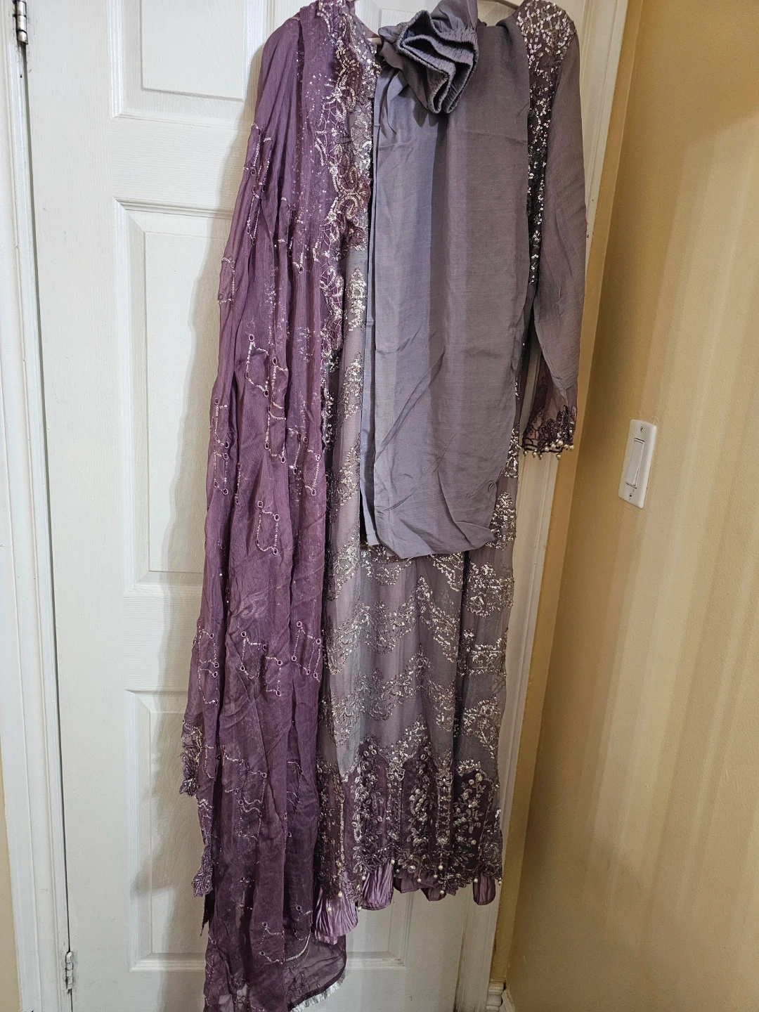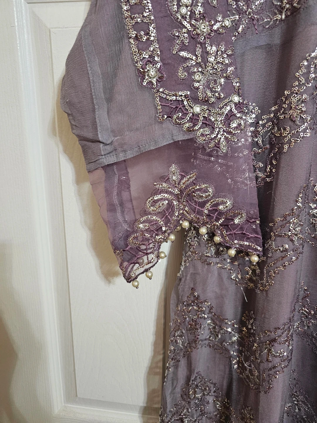 Beautiful purple kameez shalwar with intricate silver sequin and bead embellishments. It comes with a matching dupatta that has a sequined border. This outfit is perfect for special occasions and celebrations!
