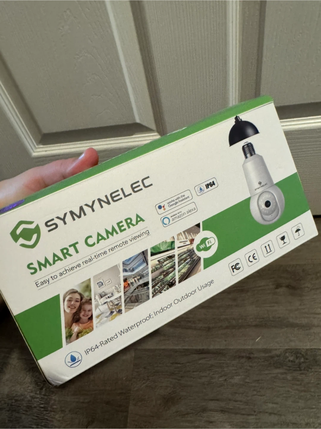 SYMYNELEC smart camera for real-time remote viewing. It's IP64-rated waterproof for indoor or outdoor usage. Works with Google Assistant and Amazon Alexa.