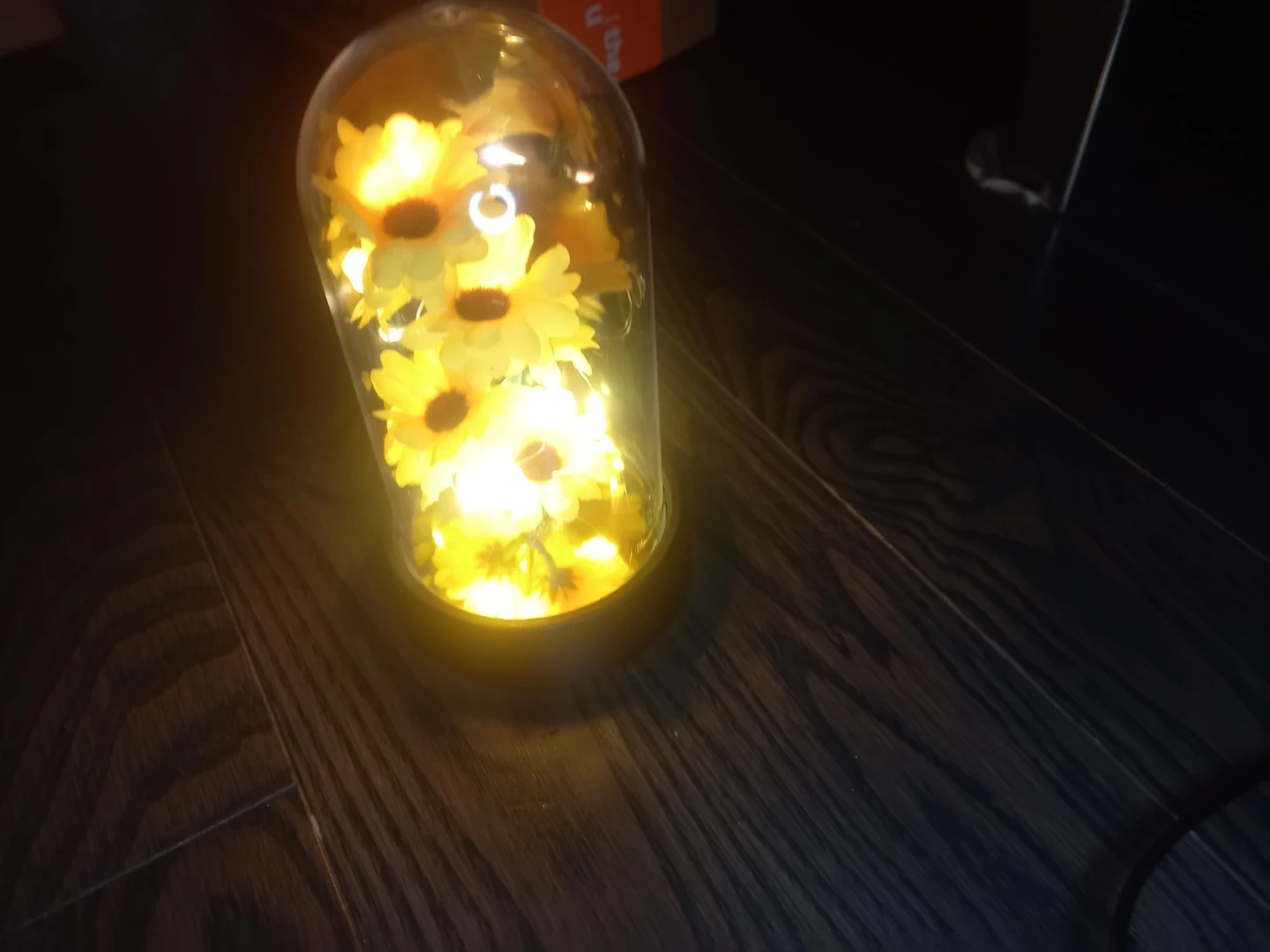 This charming decorative dome features faux sunflowers nestled amongst delicate LED string lights. It's designed to add a warm glow and a touch of nature to any space. The glass dome protects the arrangement while showcasing its beauty.