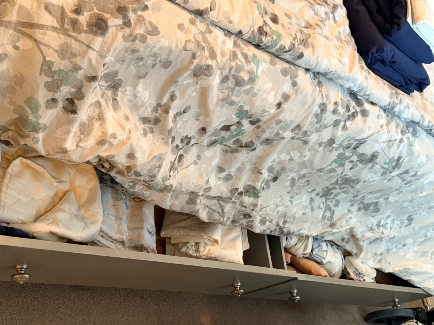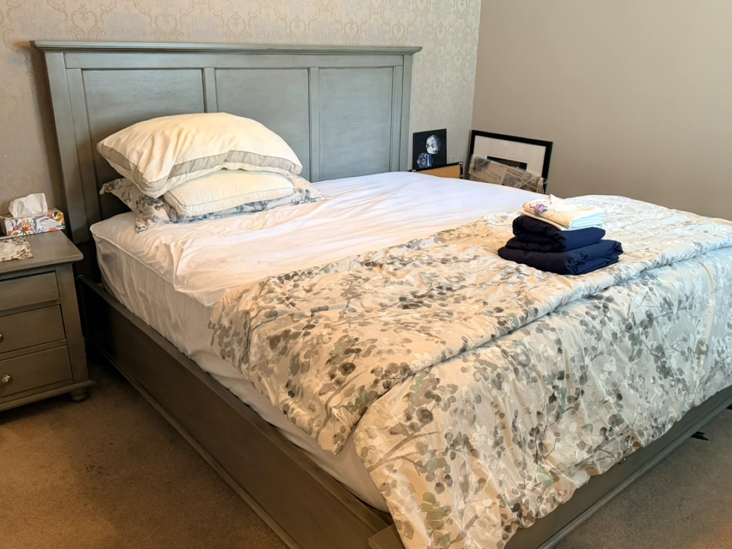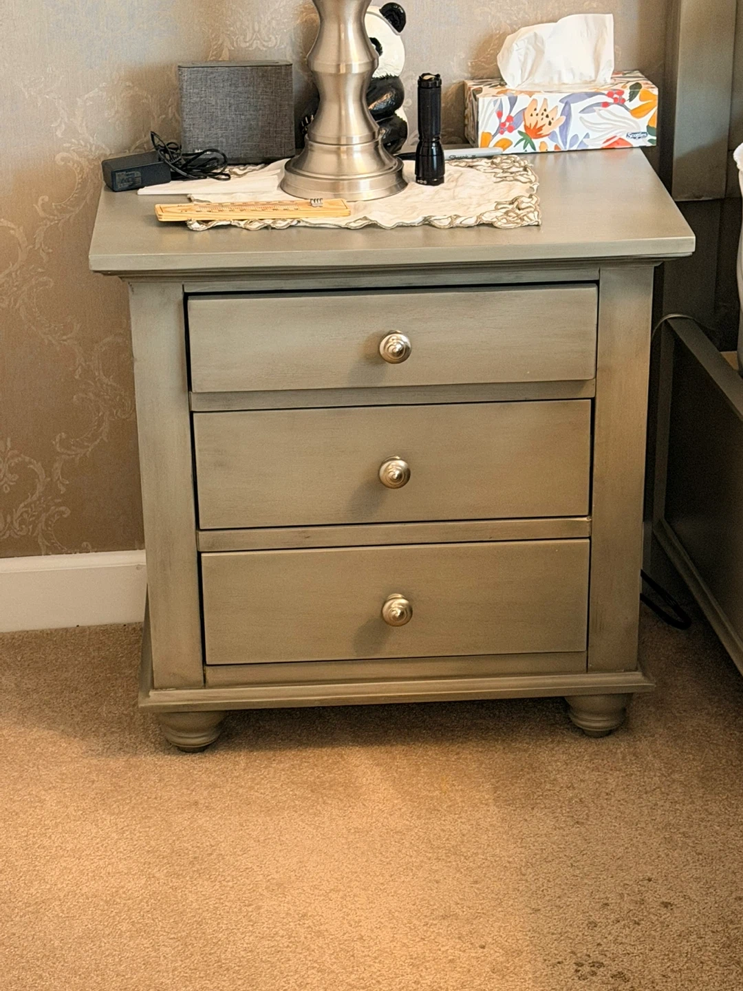 “Thomasville” king sized bed frame with matching nightstands (x2). Grey/green color with brushed nickel hardware. The bed frame features a panel headboard and footboard with 2 storage drawers . The nightstands have three drawers for storage. Can include mattress, barely used. It’s been in a spare room since it was purchased. Smoke & pet free home