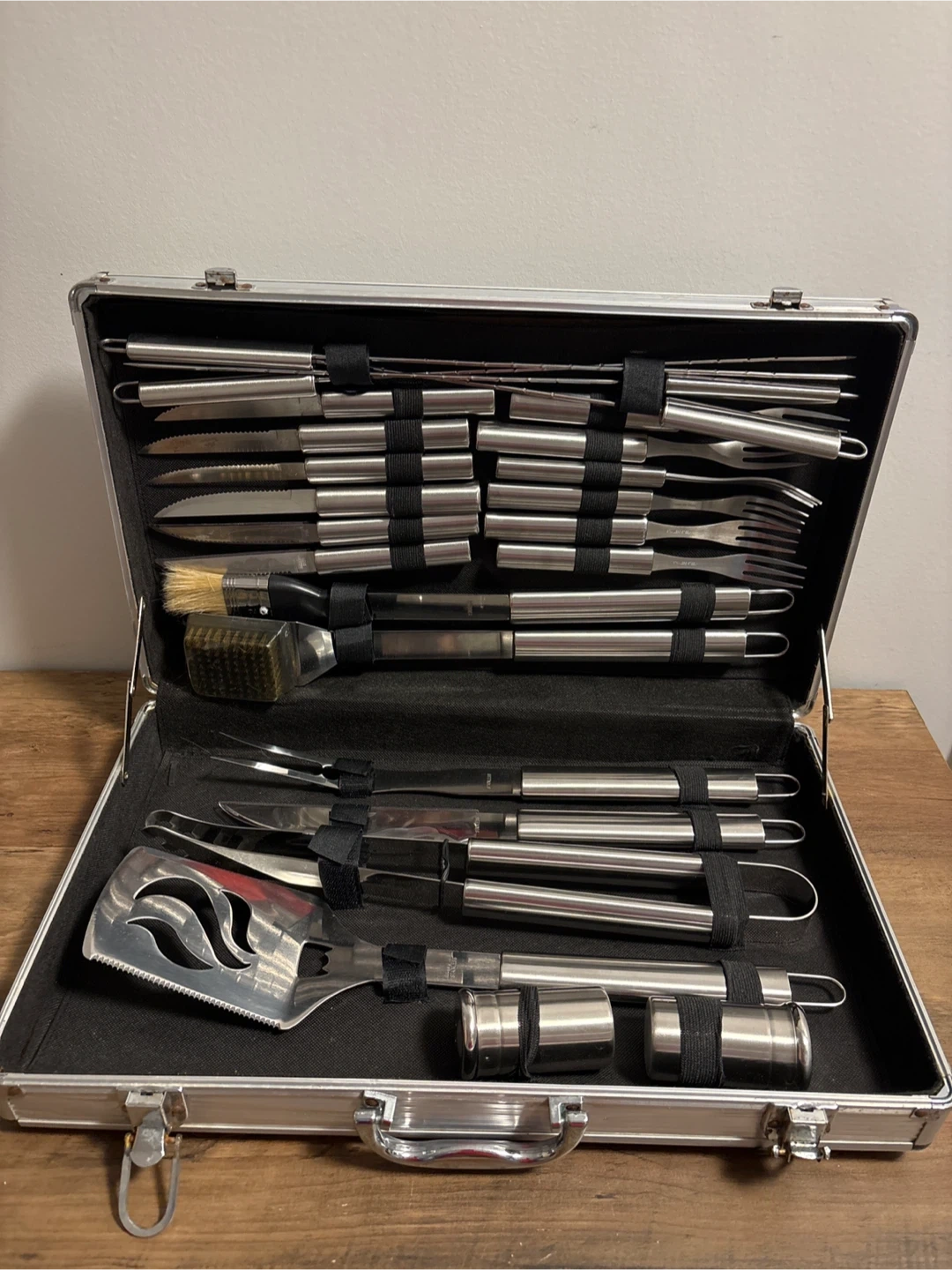 Complete BBQ grill tool set neatly organized in a durable aluminum case! Includes a variety of stainless steel tools such as spatulas, forks, knives, tongs, a basting brush, and even salt and pepper shakers. Perfect for grilling season and keeping everything tidy