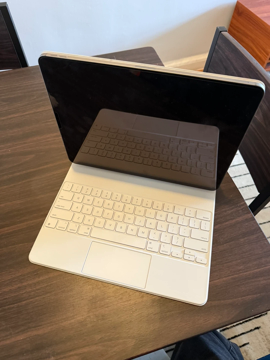 This is an Apple Magic Keyboard designed for iPad Pro. It features a trackpad and a full-size keyboard with backlit keys. The keyboard's case is white and offers a protective cover for your iPad.