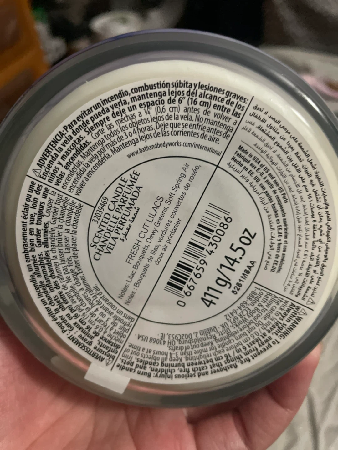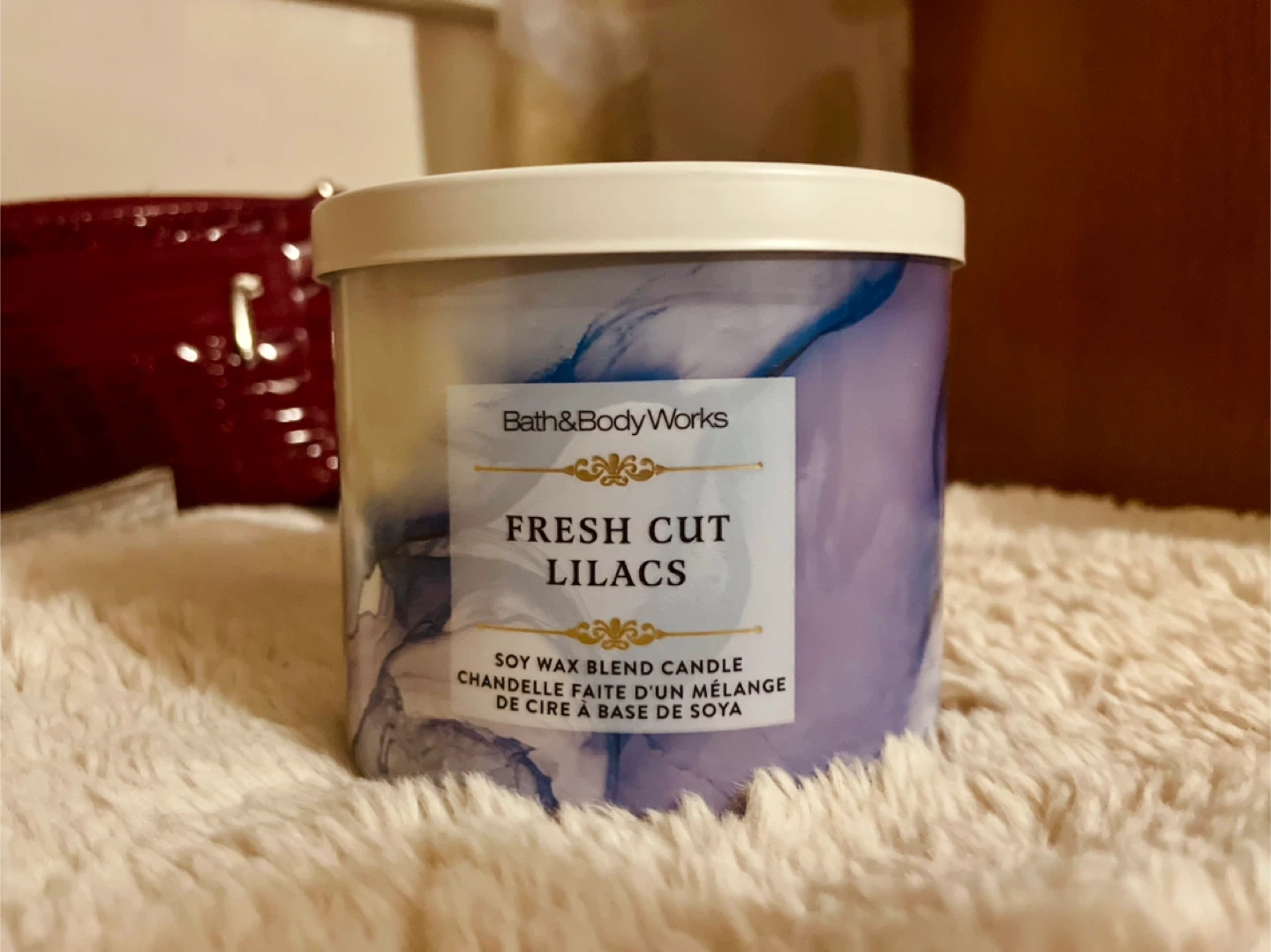 Bath & Body Works three-wick scented candle in Fresh Cut Lilacs. Soy wax blend candle with scents of lilacs, dew greens, and soft spring air.