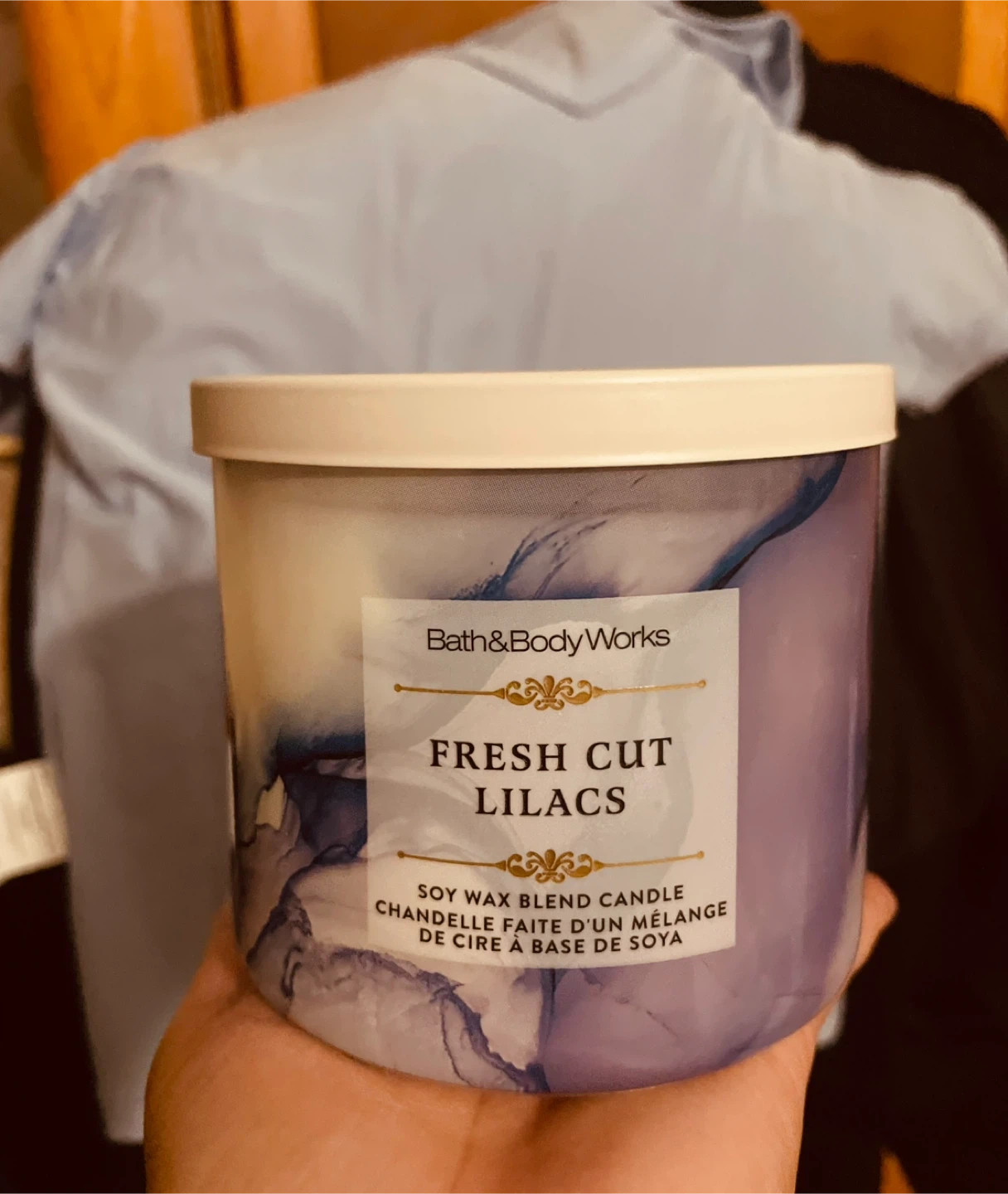Bath & Body Works three-wick scented candle in Fresh Cut Lilacs. Soy wax blend candle with scents of lilacs, dew greens, and soft spring air.