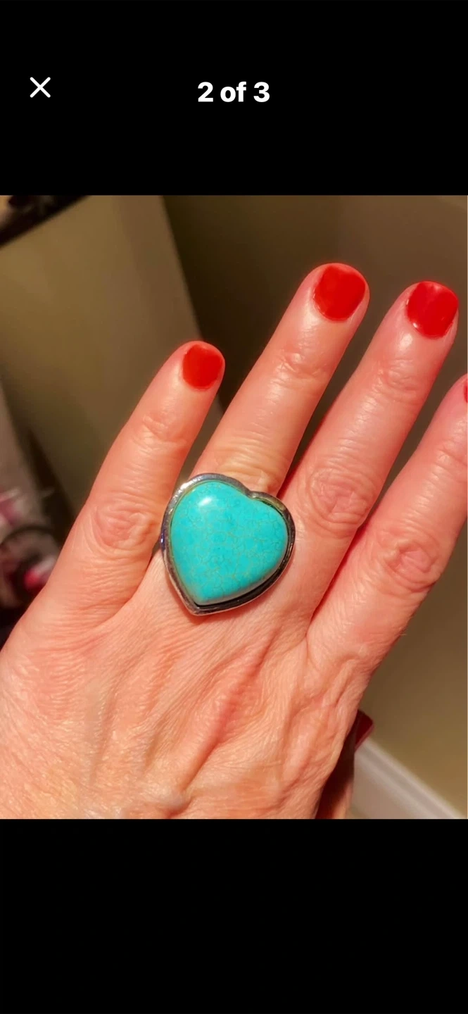🩵Selling a beautiful large heart-shaped turquoise silver ring! It comes in a cute little box, perfect for gifting or keeping it safe. The ring features a lovely turquoise stone with a unique crackled pattern and a shiny silver setting. It's in great condition and ready to add a pop of colour to your style!🩵