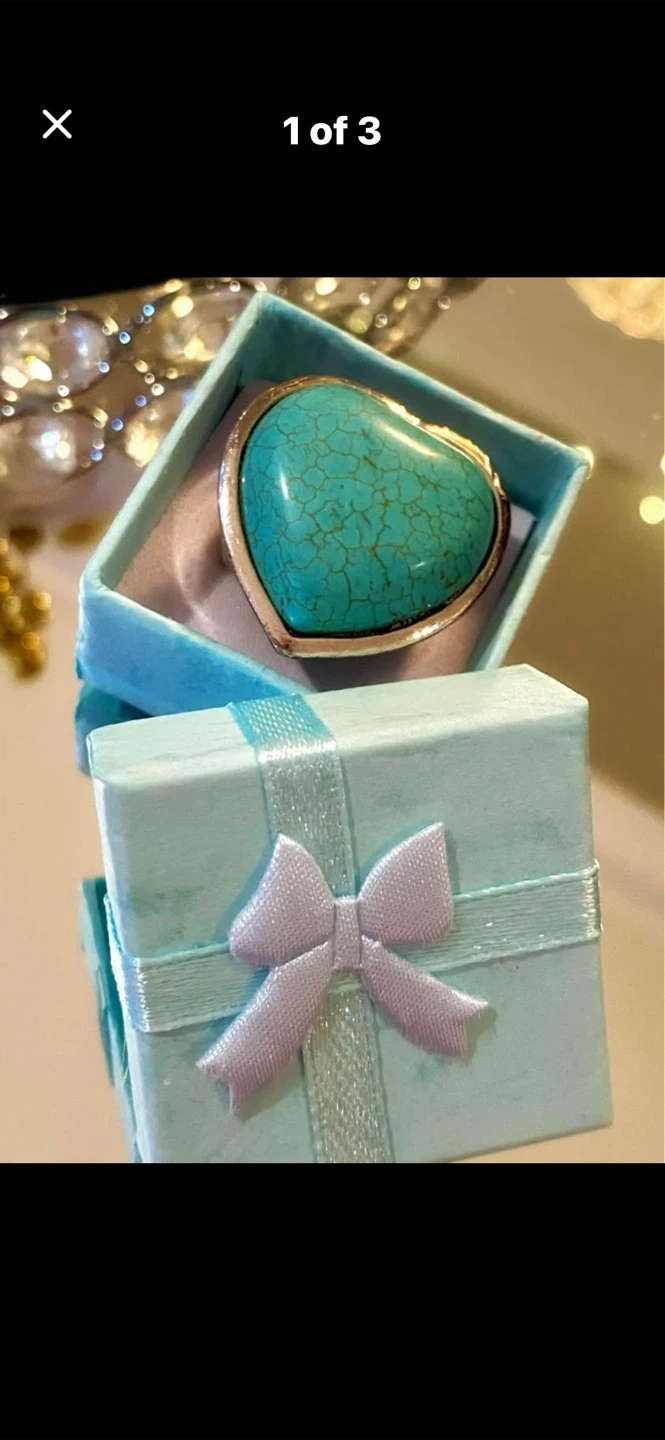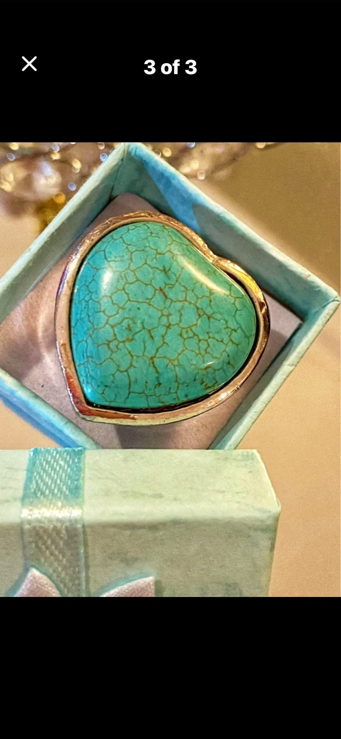 🩵Selling a beautiful large heart-shaped turquoise silver ring! It comes in a cute little box, perfect for gifting or keeping it safe. The ring features a lovely turquoise stone with a unique crackled pattern and a shiny silver setting. It's in great condition and ready to add a pop of colour to your style!🩵