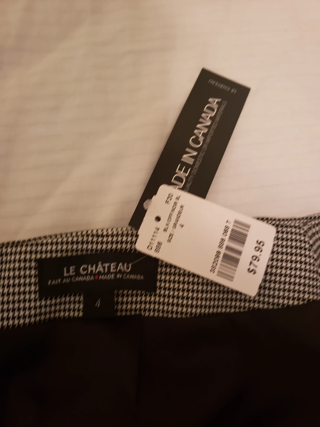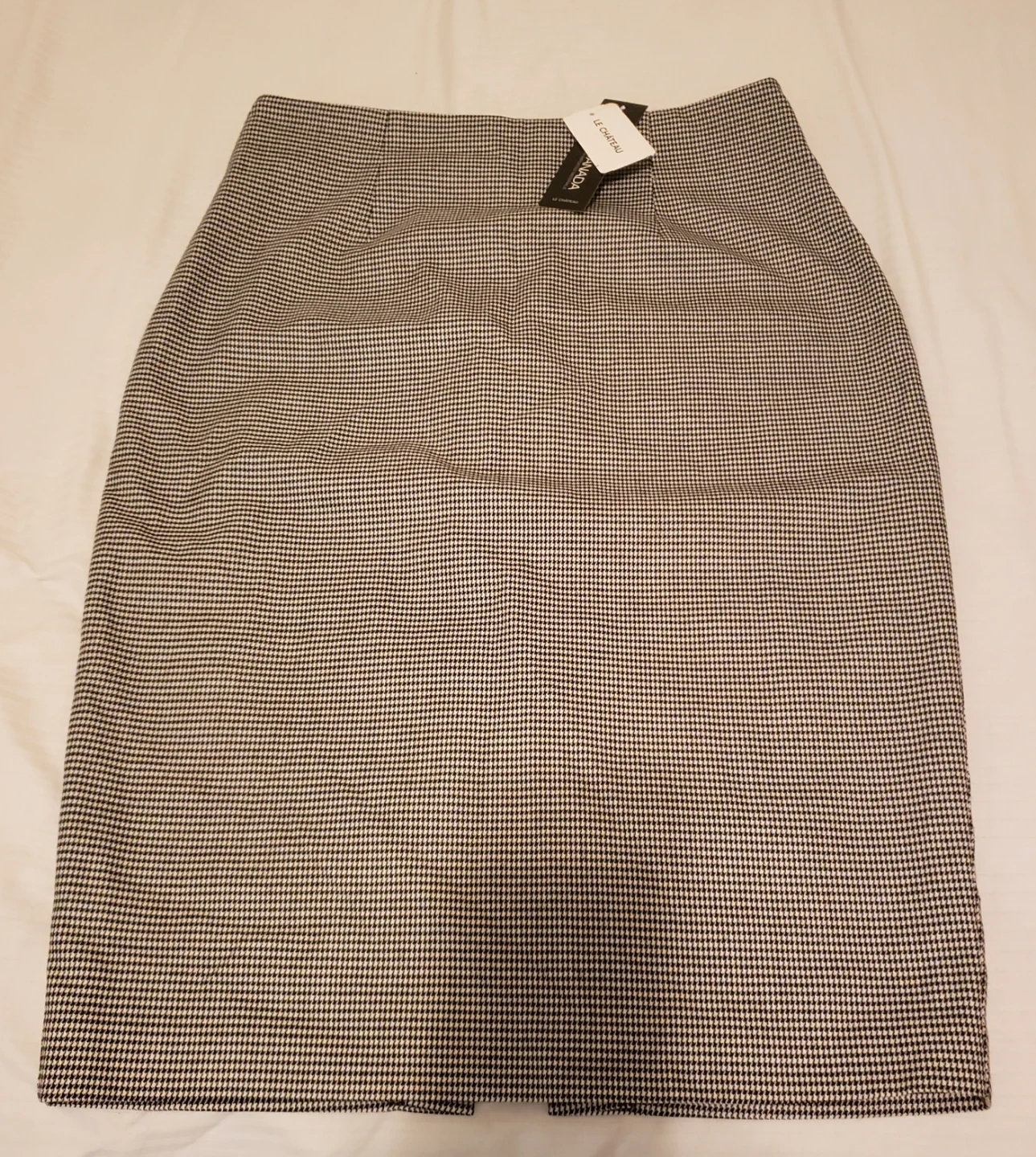 This LE CHÂTEAU pencil skirt features a classic black and white houndstooth pattern. It's a size 4 with a zippered back and a front slit. Made in Canada.