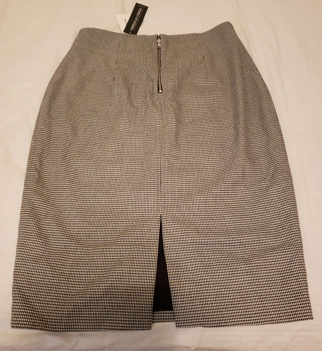 This LE CHÂTEAU pencil skirt features a classic black and white houndstooth pattern. It's a size 4 with a zippered back and a front slit. Made in Canada.