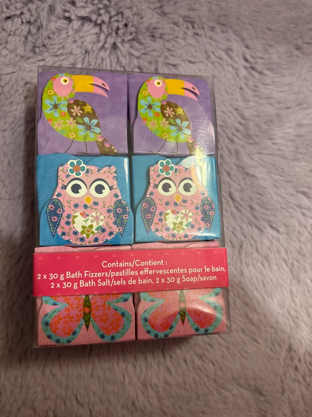 This bath set includes 2 x 30g bath fizzers, 2 x 30g bath salts, and 2 x 30g soaps. Each item features a cute and colourful design with toucans, owls, and butterflies.