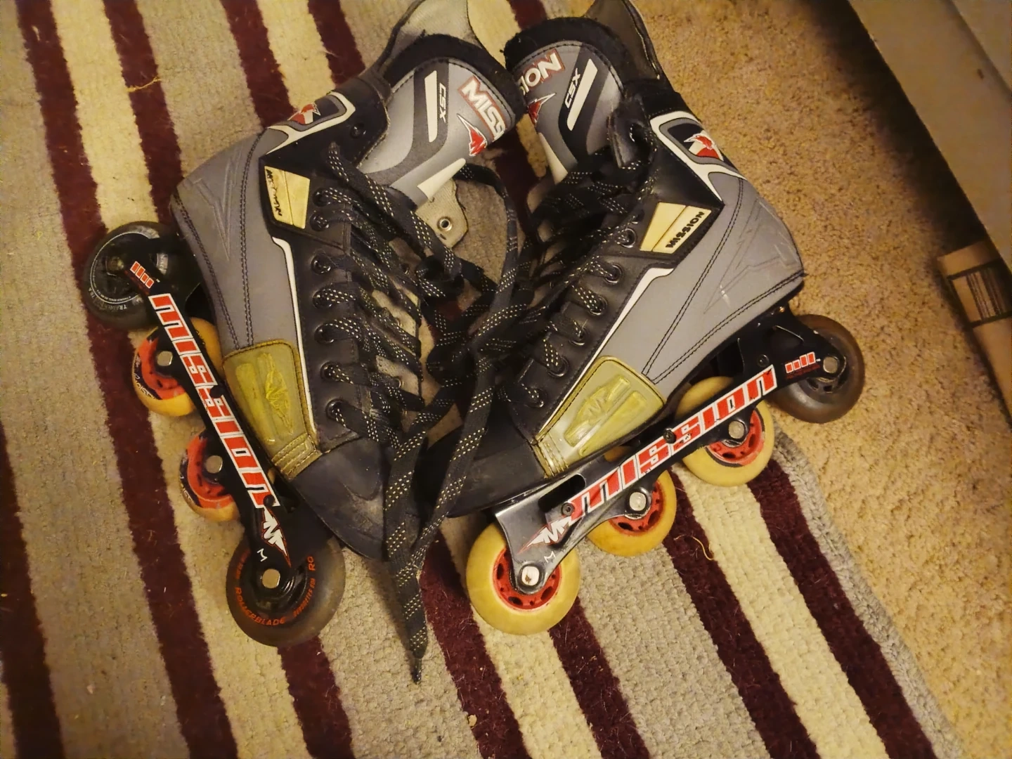 Mission CSX inline roller hockey skates with laces. These skates have a black and grey colourway with red and yellow wheels. They're designed for inline hockey.