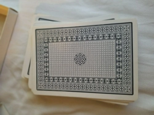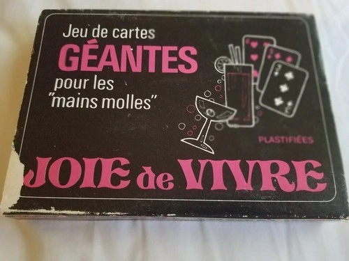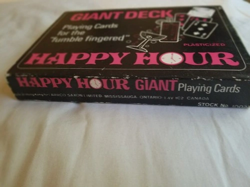 Set of Giant Happy Hour playing cards made for Arrco Saxon Limited. These are plasticized cards and all are present. They measure approximately 4.5" W x 6.75" L. They're described as being for the "fumble fingered"! The case shows some wear, but the cards themselves are well-stored and crisp. Great for family fun and card games.
