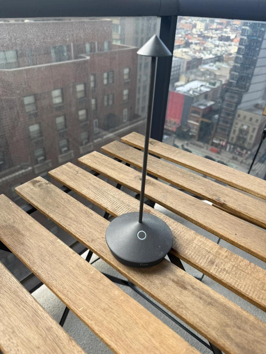 Original Pina portable LED desk lamp offers a sleek, modern design. It's finished in a matte black with a conical shade and a circular base. Battery powered for easy placement anywhere!
