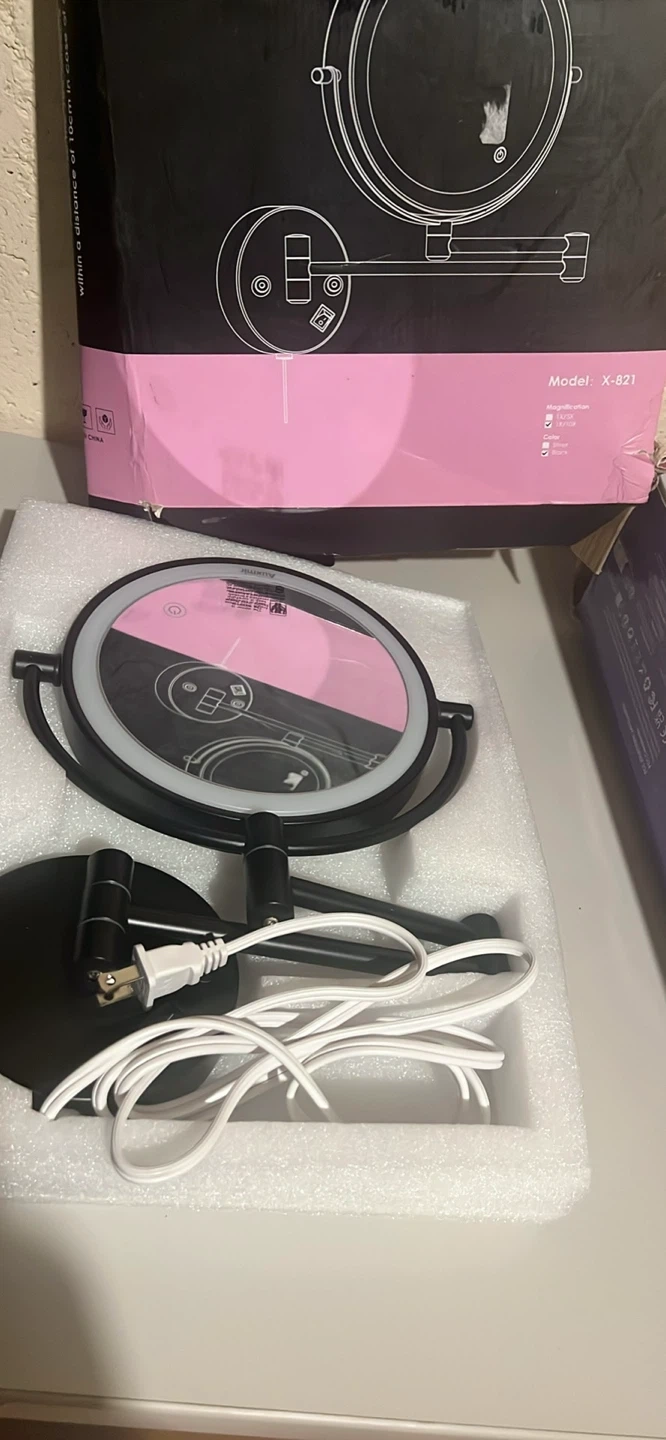 This is a 3x magnifying vanity mirror with a built-in LED light. It's a double-sided, rotatable mirror designed for wall mounting. The mirror comes with a power cord and plug.