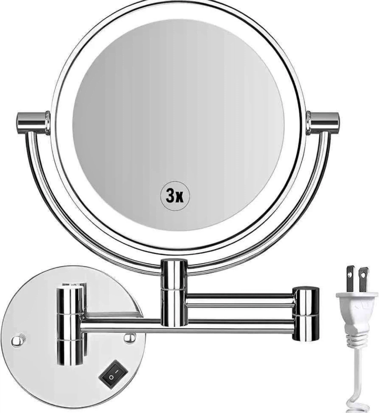 This is a 3x magnifying vanity mirror with a built-in LED light. It's a double-sided, rotatable mirror designed for wall mounting. The mirror comes with a power cord and plug.