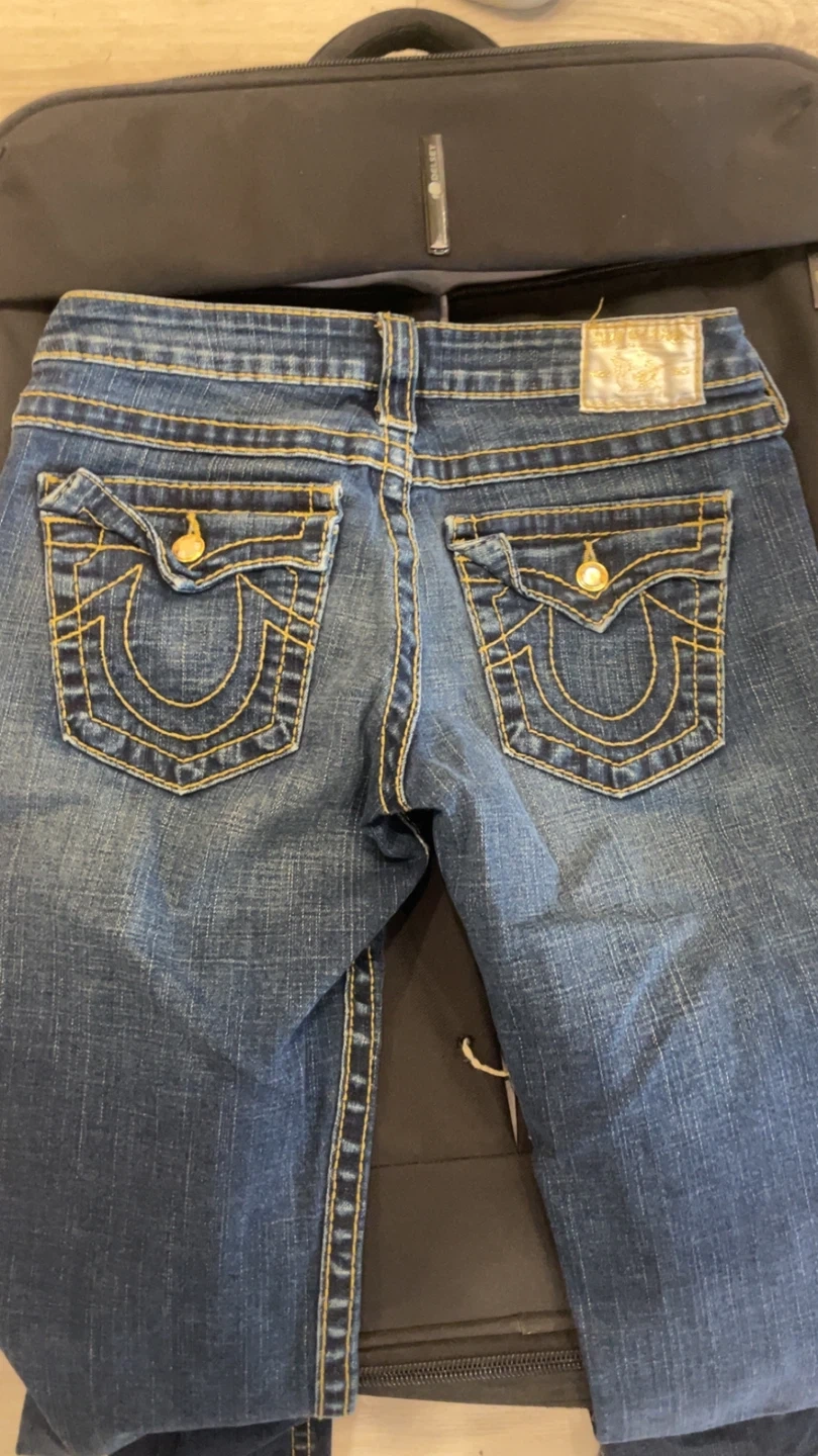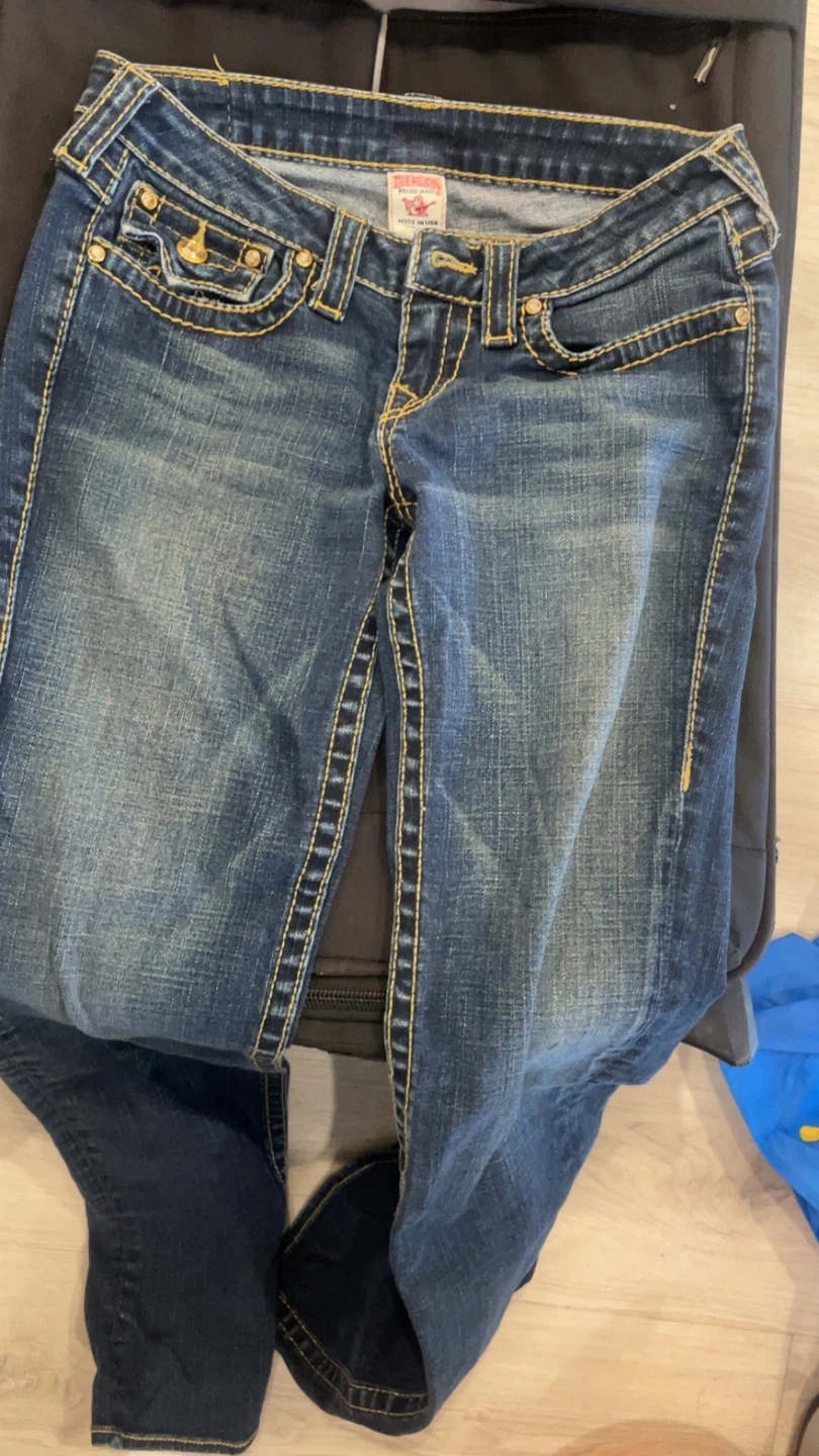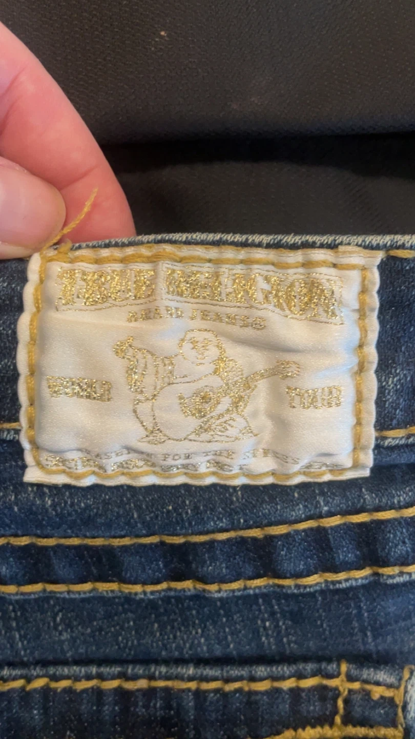 These are blue True Religion denim jeans. They feature the brand's signature stitching and Buddha logo patch.