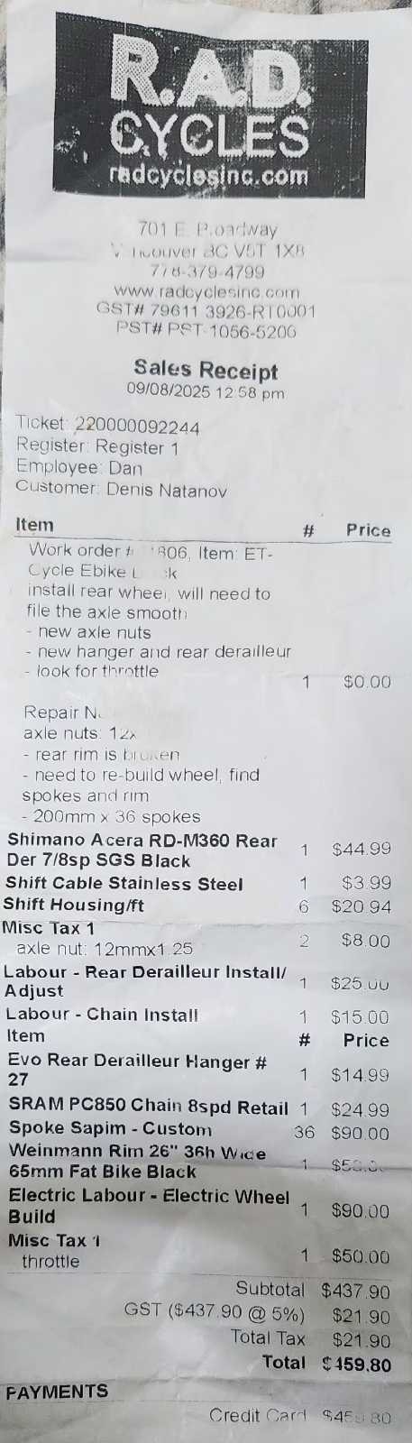 Selling my ET.Cycle T720 Electric Fat Bike. It’s a beast for commuting and delivery, and I’m including a spare battery so you get double the range. Mechanically Solid: Just spent $460 at Rad Cycles (Vancouver) in September to rebuild the rear wheel (new rim/spokes) and install a brand new Shimano derailleur and chain. Receipt available. Ride Ready: Brakes, gears, and electronics all working perfectly. Cosmetics: Good condition, normal wear for a used bike. Includes: Bike + 2 Keys, 2x Lithium Batteries, Charger, Rear rack. Located in Vancouver.