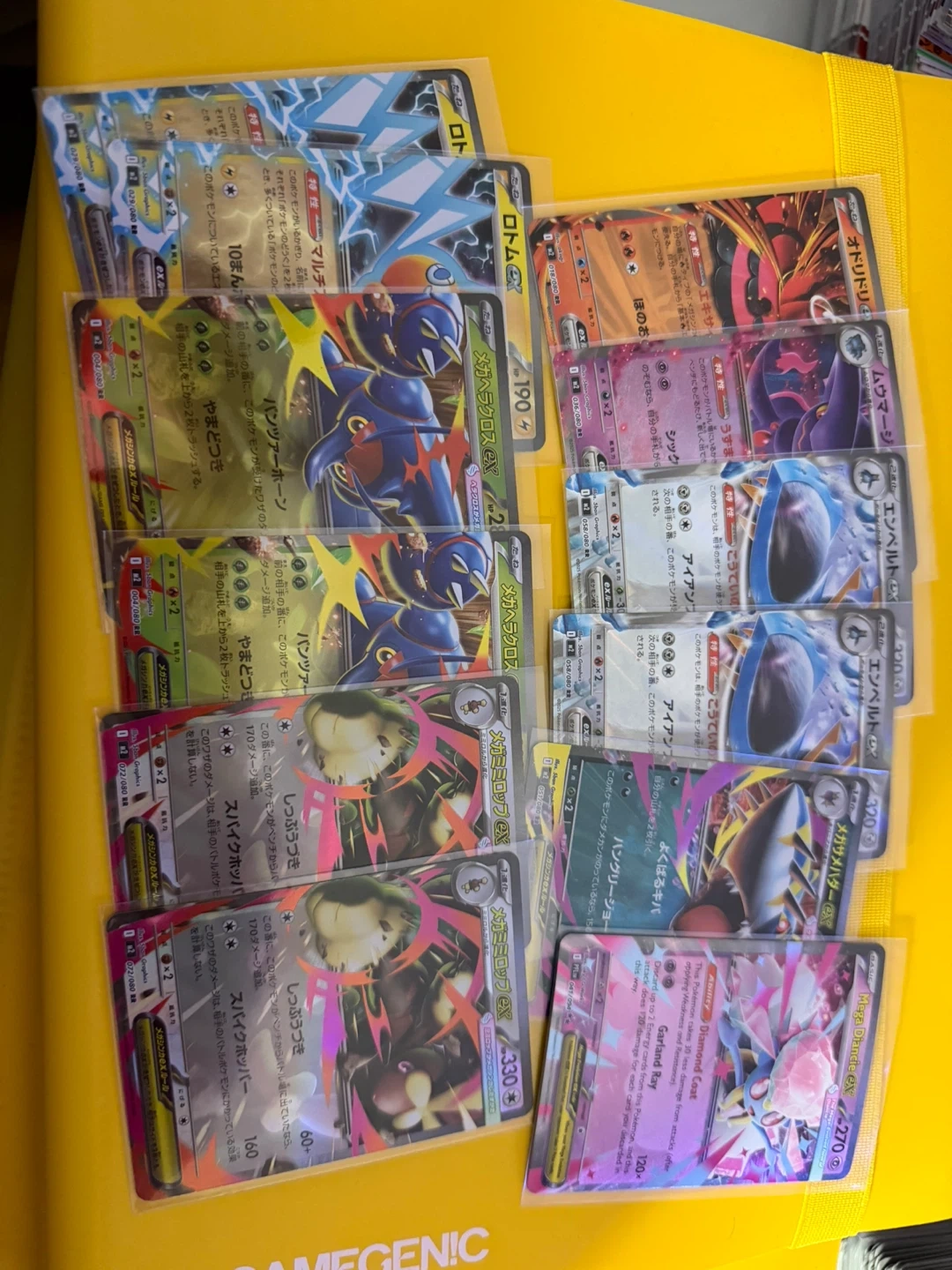 Selling a collection of various Pokémon trading cards. Includes Mega Evolutions and EX cards like Mega Heracross, Mega Diancie, and Mega Sharpedo. Cards feature different Pokémon with unique abilities and attack stats.