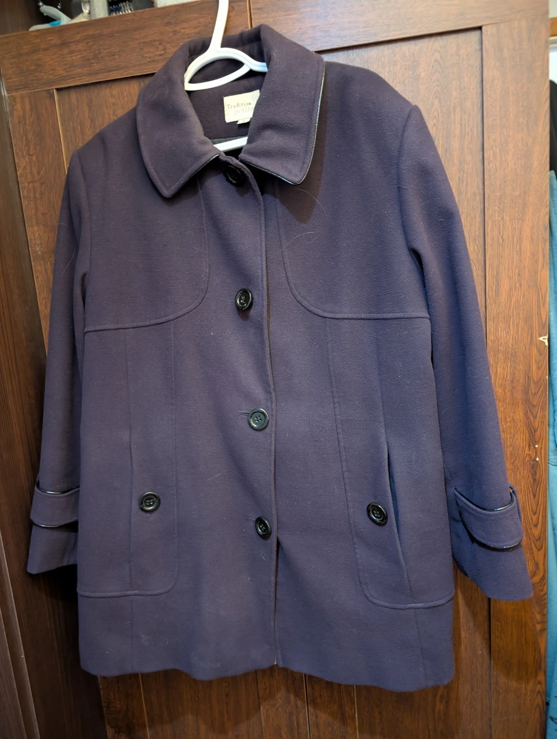 This is a Tradition Petite jacket in a size 16. It's a dark purple colour and features a button-up front. The jacket has a classic collar and two front pockets.