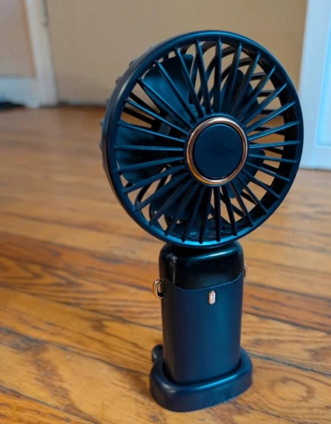 This is a Koonie F211 battery-operated handheld fan. It's black with rose gold accents. Includes a charging base. This fan is portable and great for on-the-go cooling!