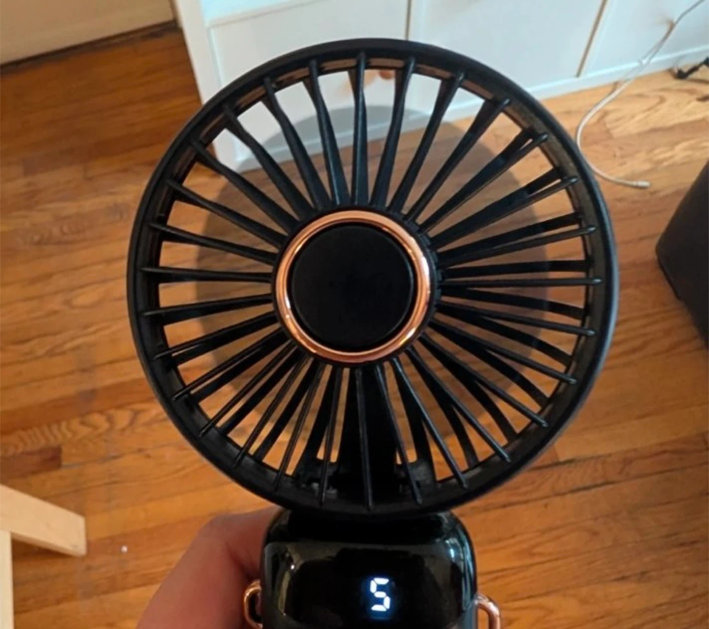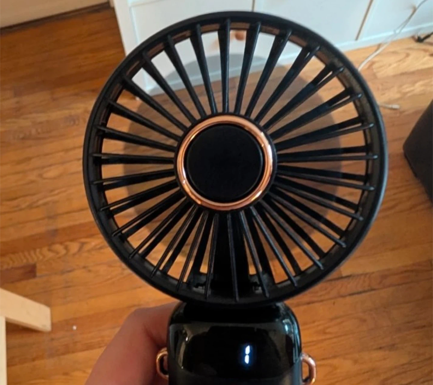 This is a Koonie F211 battery-operated handheld fan. It's black with rose gold accents. Includes a charging base. This fan is portable and great for on-the-go cooling!