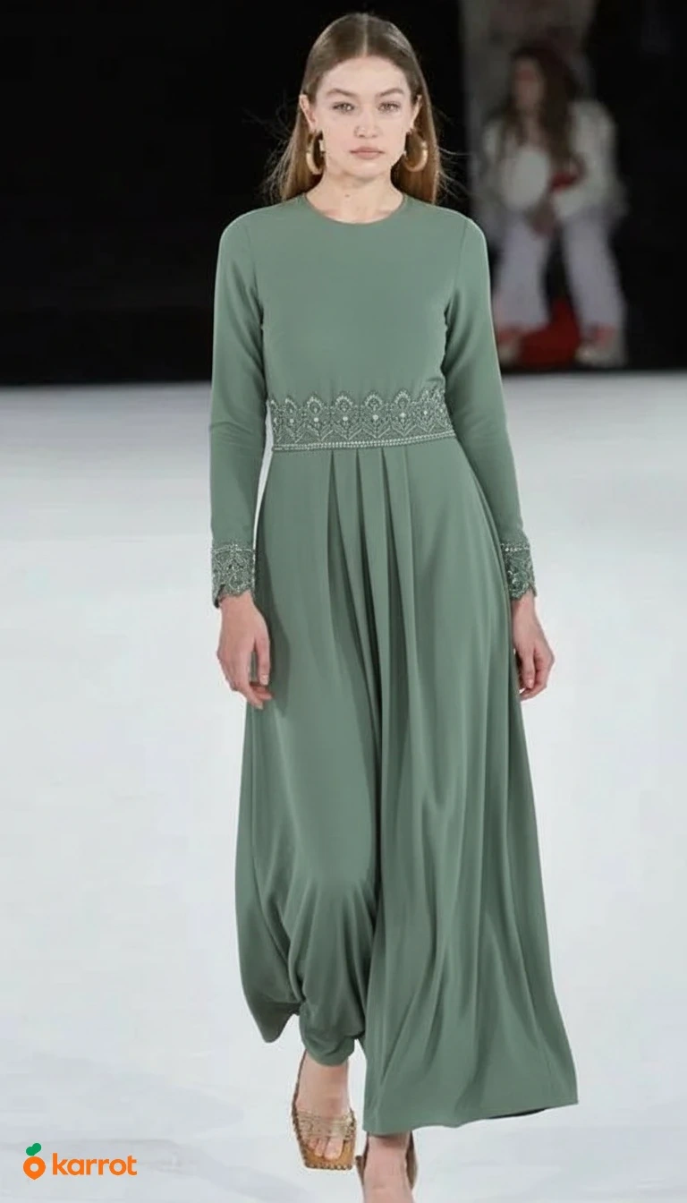 This Morraine & Star dress features long sleeves and a decorative beaded waistband. It's a size Large with a flattering pleated skirt. The sleeves and neckline have elegant beadwork.