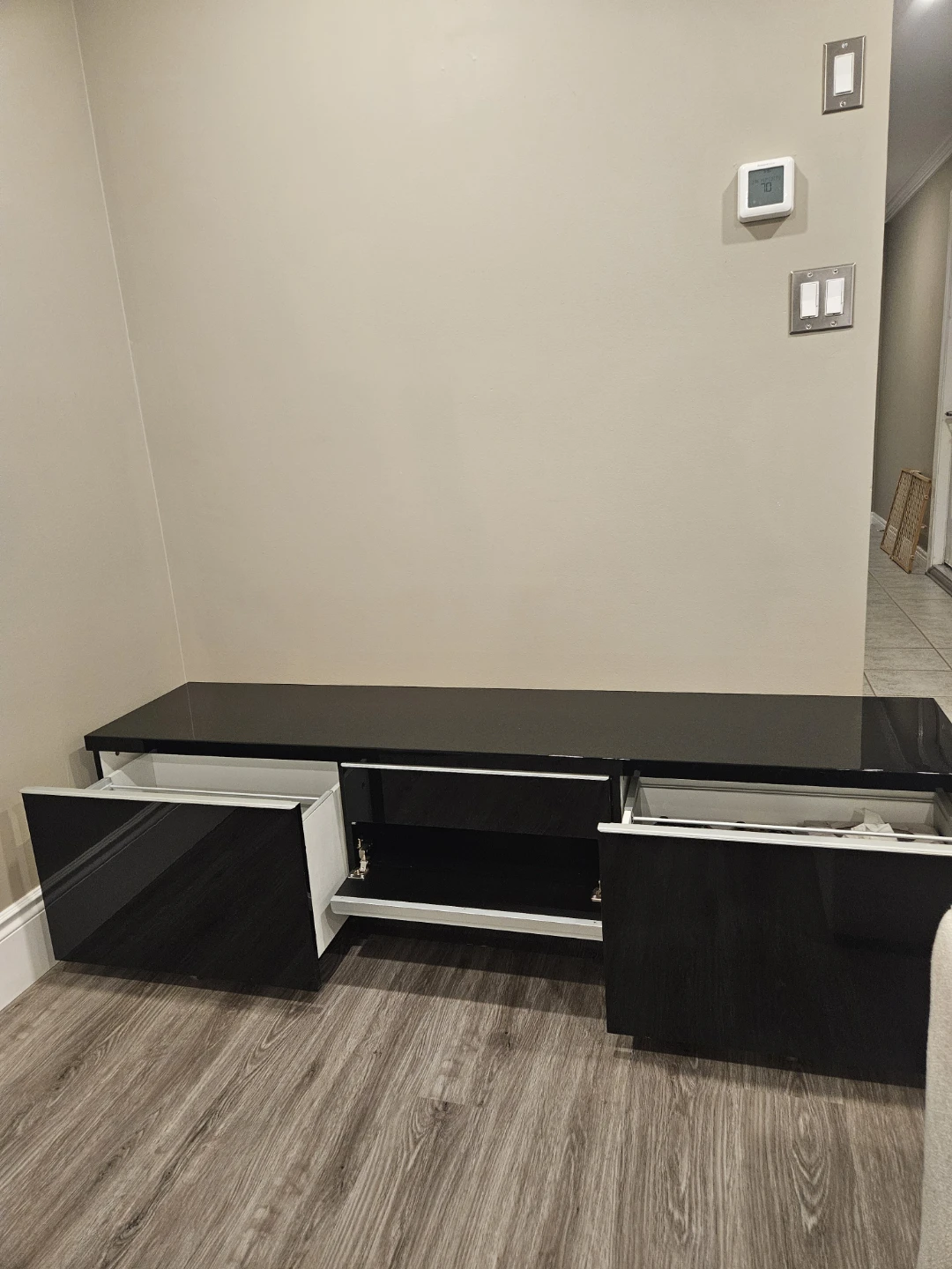 Features a clean, minimalist design with smooth high-gloss finish that’s easy to wipe clean. Spacious drawers provide great hidden storage for media devices, cables, remotes, and more.