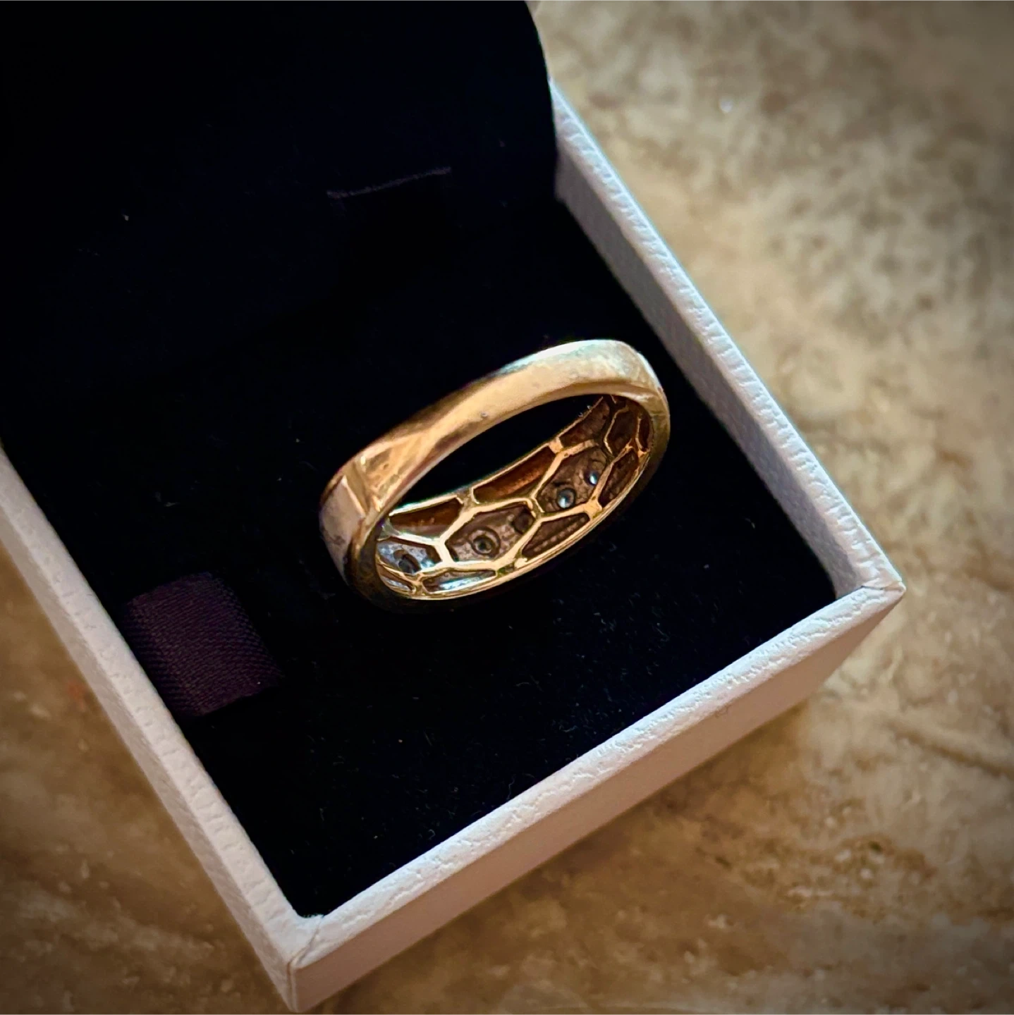 Stunning 10K yellow and white gold ring / wedding band, set in a strong masculine frame, with a row of 7 bright diamonds. Weighs over 6g and is hallmarked. Size 10.