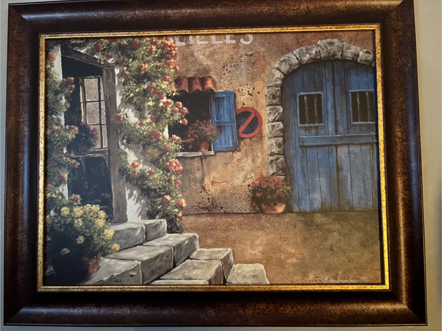 This framed painting depicts a charming European courtyard with a blue door and blooming roses. It's a lovely piece of art for home decor. The artwork is in a dark, ornate frame.