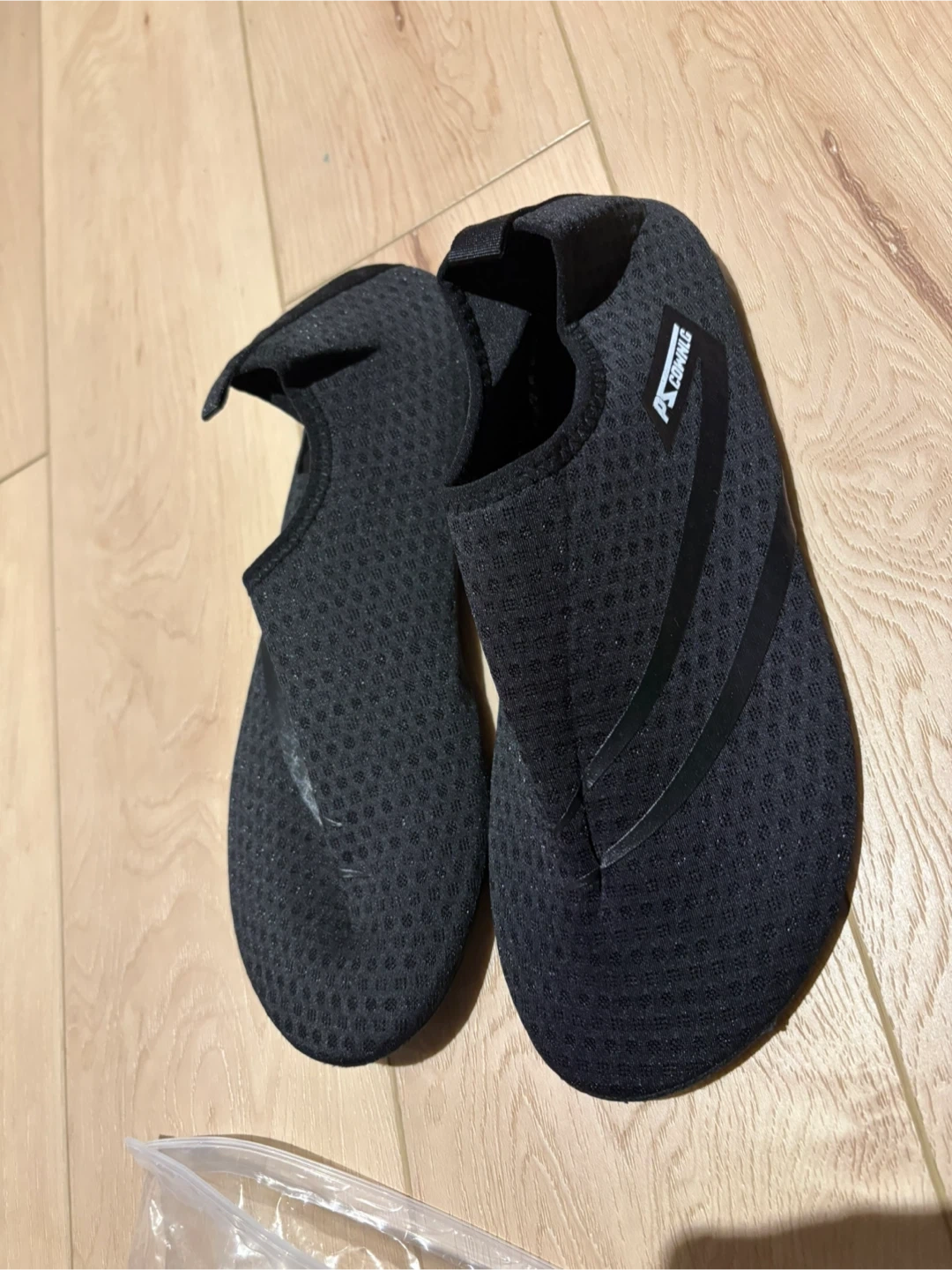 These black water shoes are from the brand PS COWNLG. They feature a quick-drying mesh upper and a grippy rubber sole for traction. They're lightweight and perfect for beach or water activities.