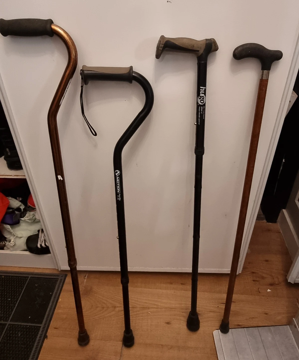 Four walking canes varying in style and material for mobility assistance.