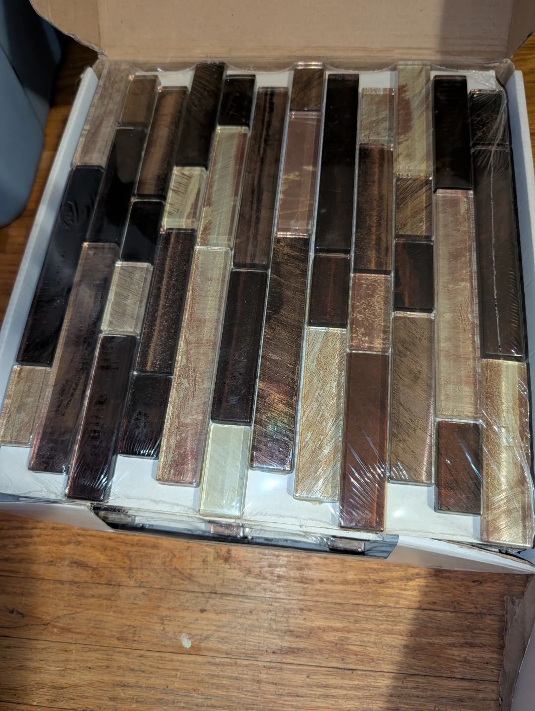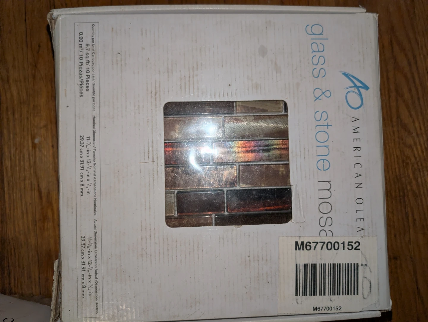 Two boxes of glass and stone mosaic tile. Each box covers 9.7 sq ft. Nominal dimensions are 11.5 x 12.5 inches.