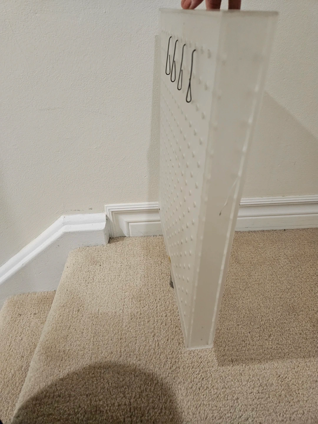 A plastic display panel for jewelry, sewing thread, or small tools. The stand is unfortunately broken, but you can glue this panel to the stand or attach it to a wall or shelf. If you're handy and want it, I' am offering it for free.