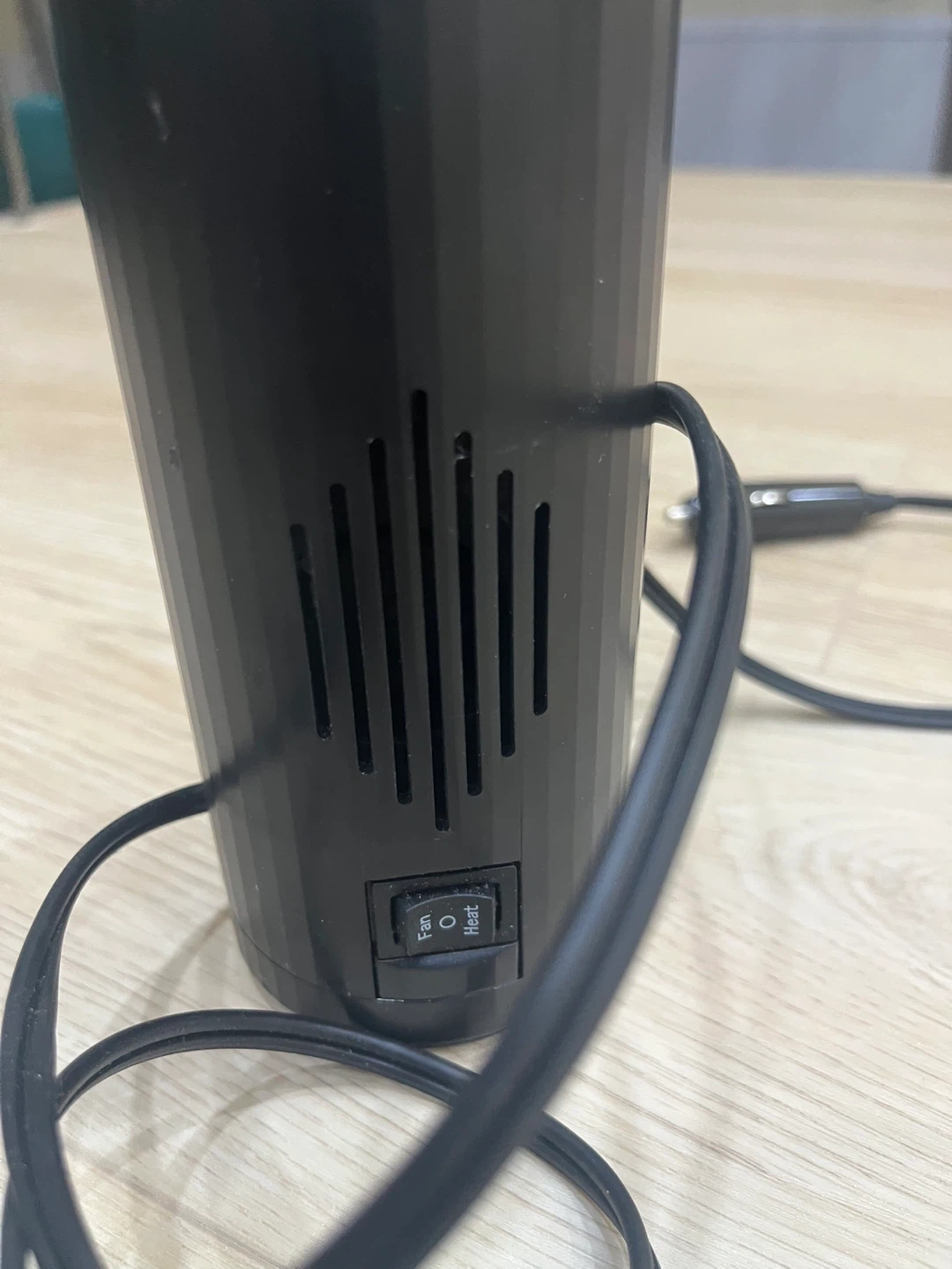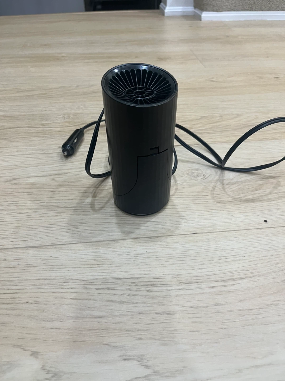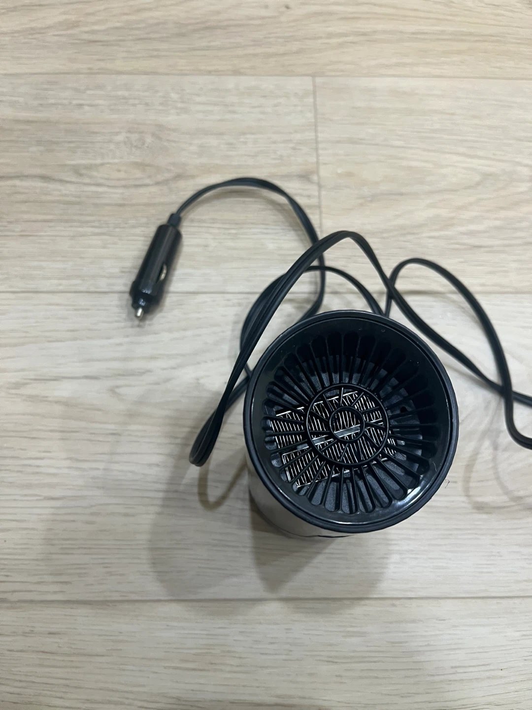 I'm selling a portable car heater fan in black. It features a fan and heat setting, perfect for keeping your car comfortable in any weather. It comes with the car charger.