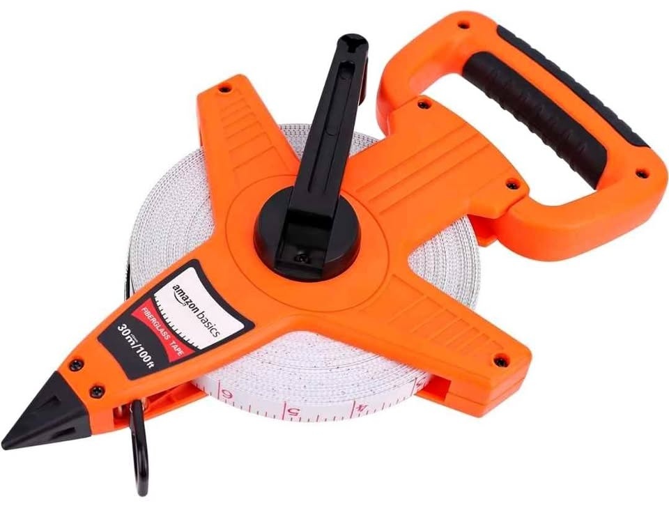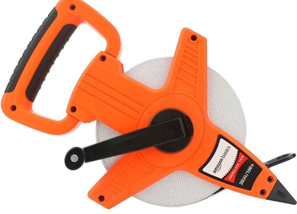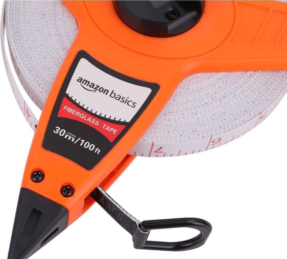 Amazon Basics Open Reel Fiberglass Tape Measure - 100-feet (30-Meters) by 1/2-Inch, Inch/Metric Scale, Impact Resistant Shell