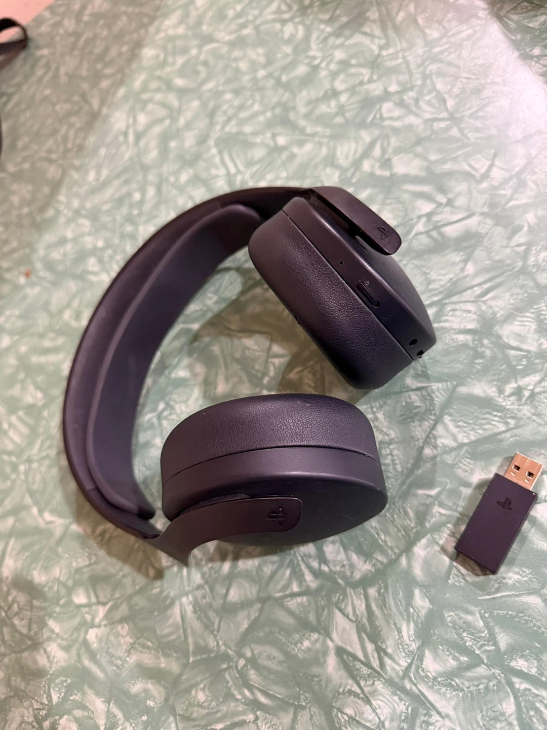 Black PlayStation Pulse 3D wireless headset with USB dongle. Enjoy immersive audio for your gaming sessions! This headset is designed for the PlayStation console.