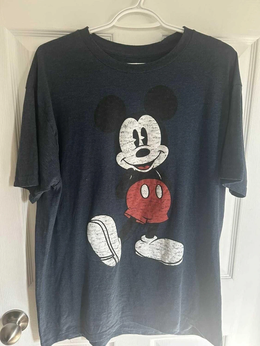 Dark blue t-shirt with a graphic of Mickey Mouse. Made of 60% cotton and 40% polyester.