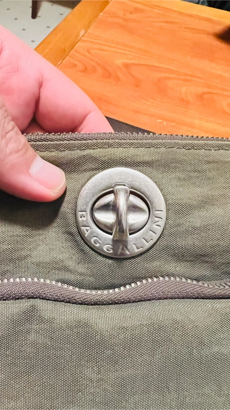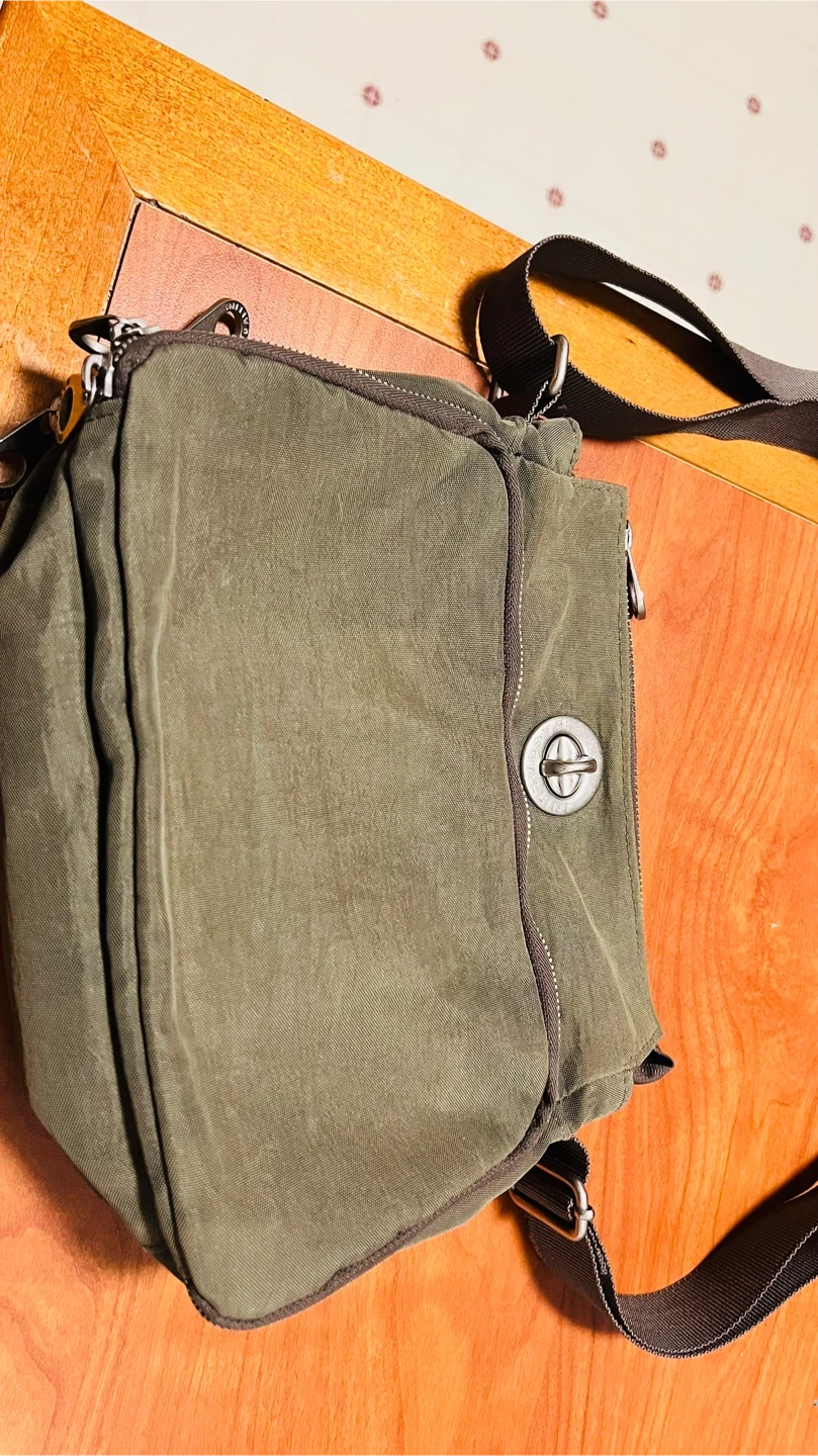 This Baggallini crossbody bag is a handy accessory for everyday use. It's made of a durable nylon material in an olive green colour. The bag features a secure clasp closure and adjustable strap.