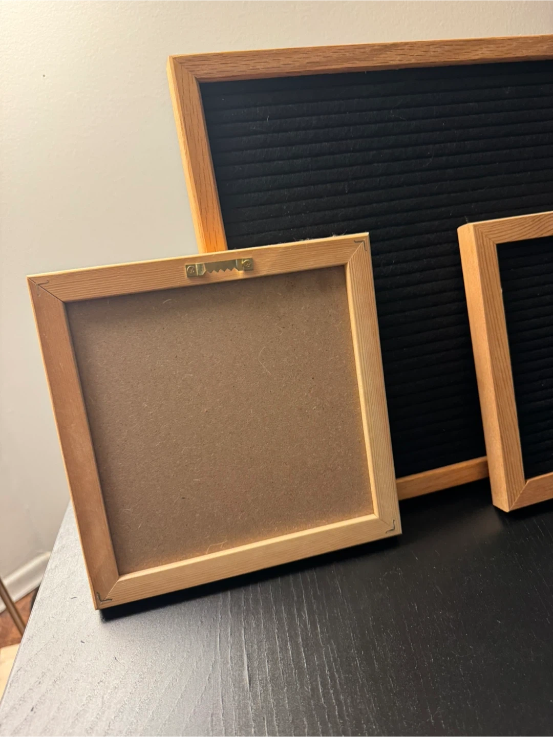 Selling a set of three felt letter boards with wooden frames. Great for displaying messages /quotes or pictures in your home or office. One comes with stands on the back while the other 2 comes with the hang to prop them up! - No letters just the board