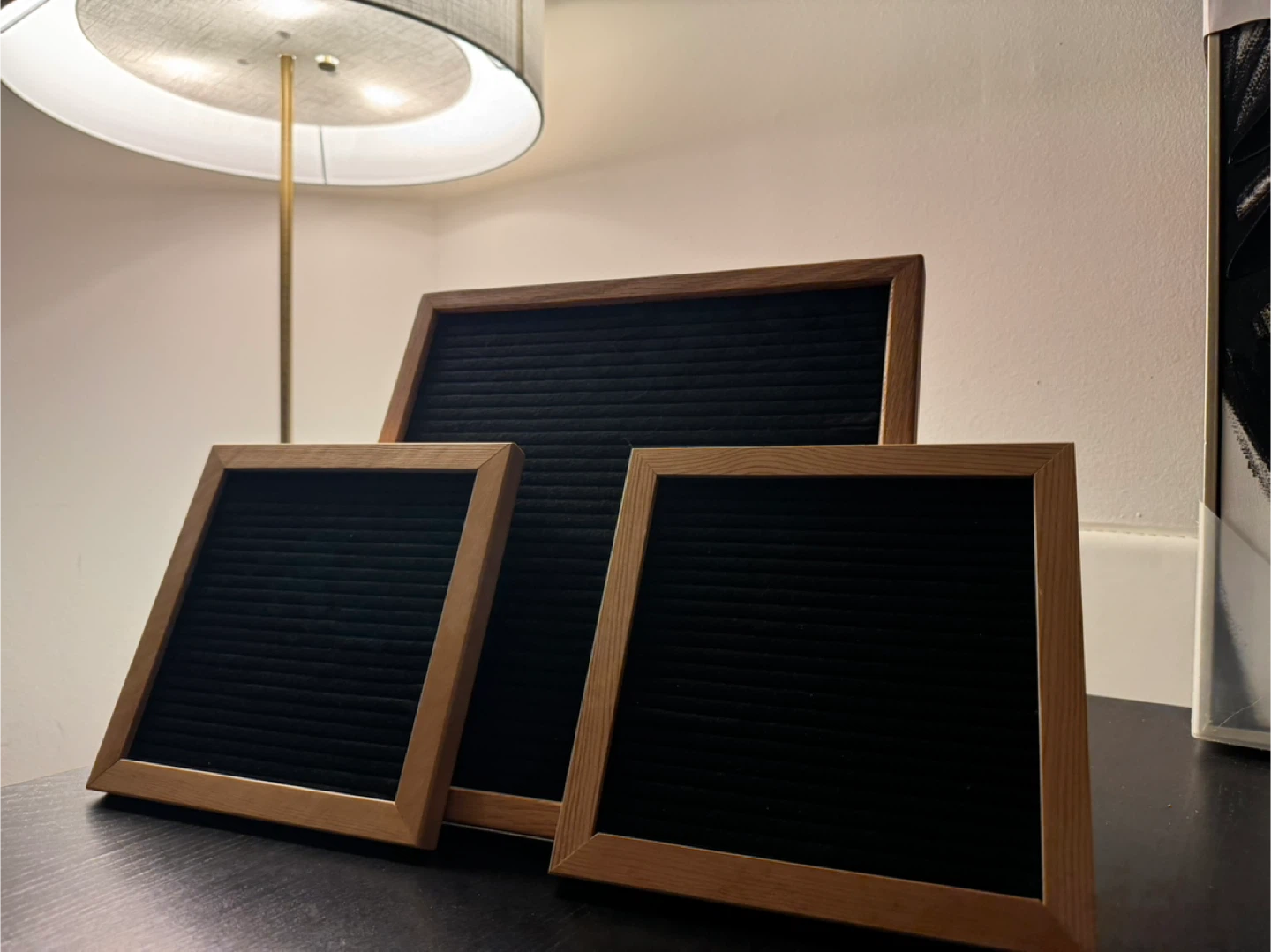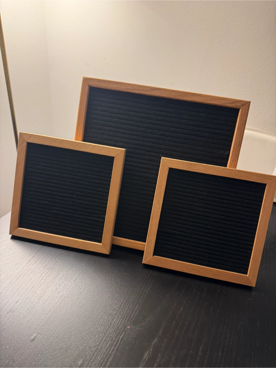Selling a set of three felt letter boards with wooden frames. Great for displaying messages /quotes or pictures in your home or office. One comes with stands on the back while the other 2 comes with the hang to prop them up! - No letters just the board