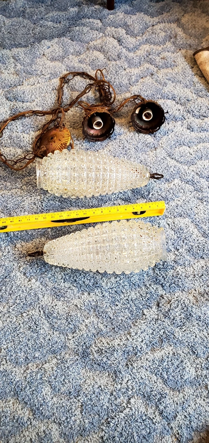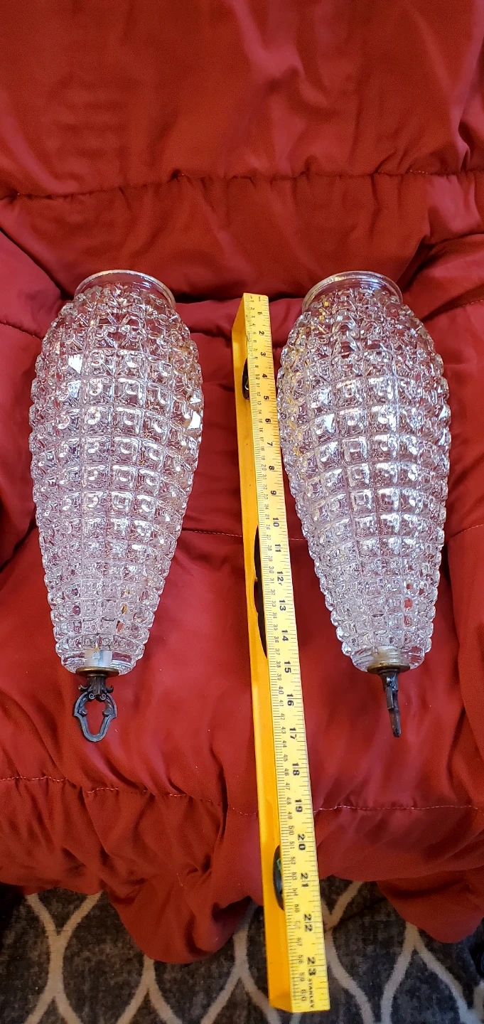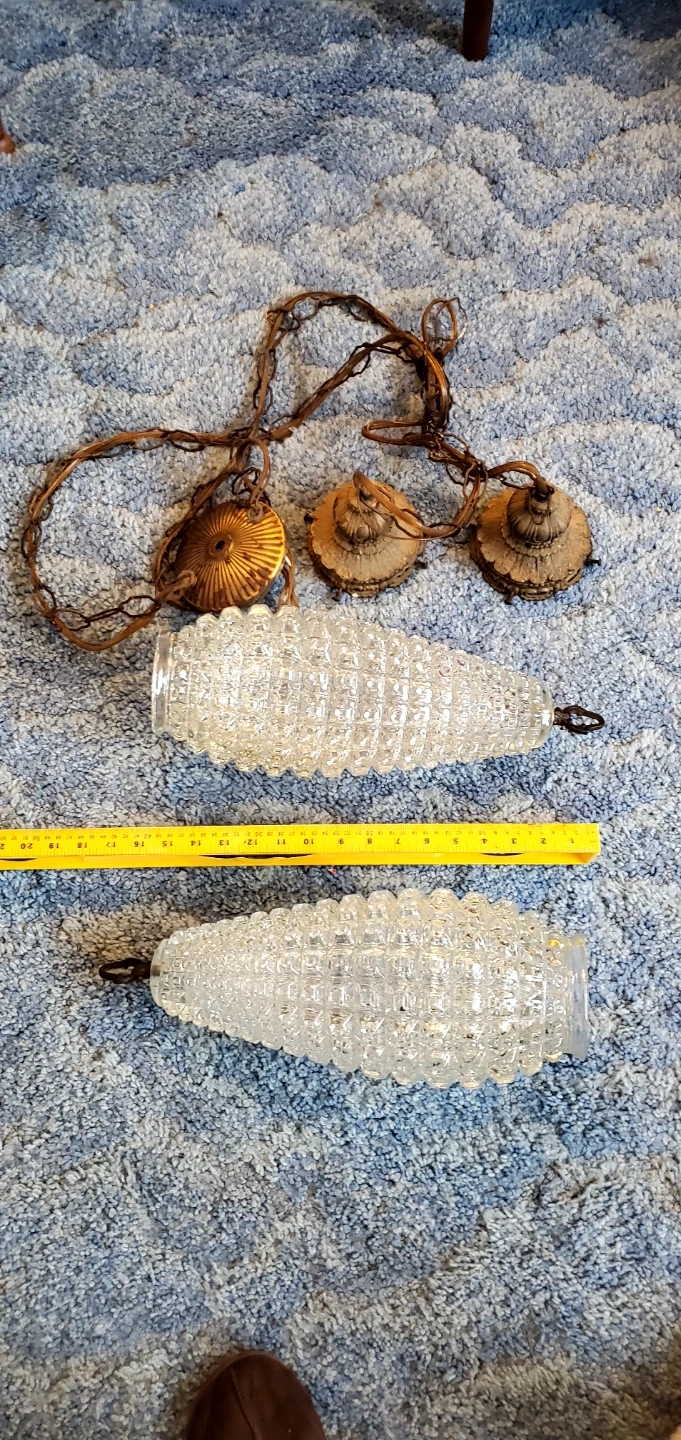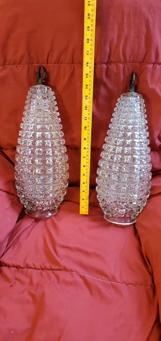 Set of two glass pineapple style light shades with decorative chain and mounting hardware. Glass shades are teardrop-shaped with a textured diamond pattern. Each shade is approximately 16 inches long. The hardware needs tlc and a good cleaning. No chips.