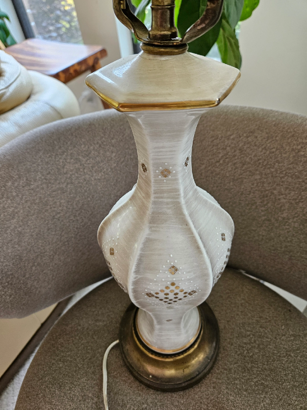 Selling a lovely table lamp with a vintage-inspired design. The base features a unique shape with gold accents, and the shade has a textured appearance. It would be a great addition to any room!