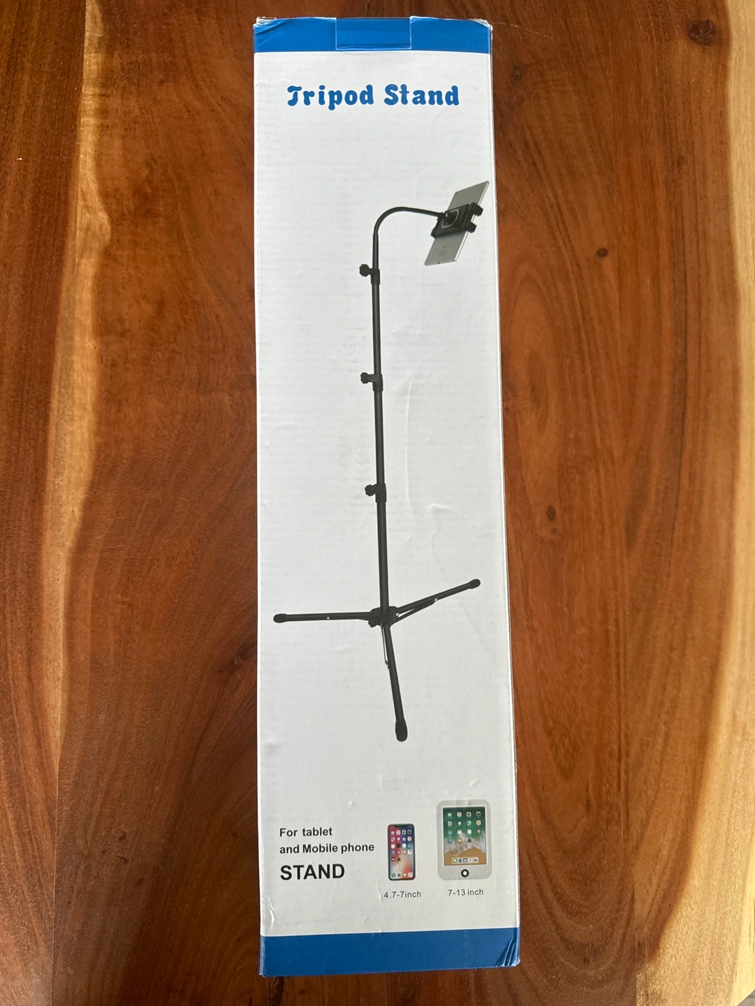 Tripod for tablet or mobile phone. Max height around 4.5 feet. Comes with a Bluetooth clicker. Height adjustable with flexible mount for free angle adjustment.