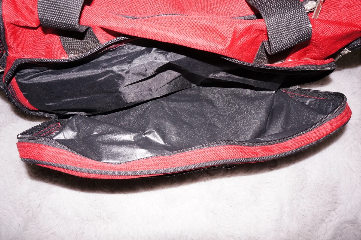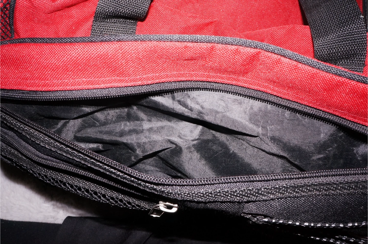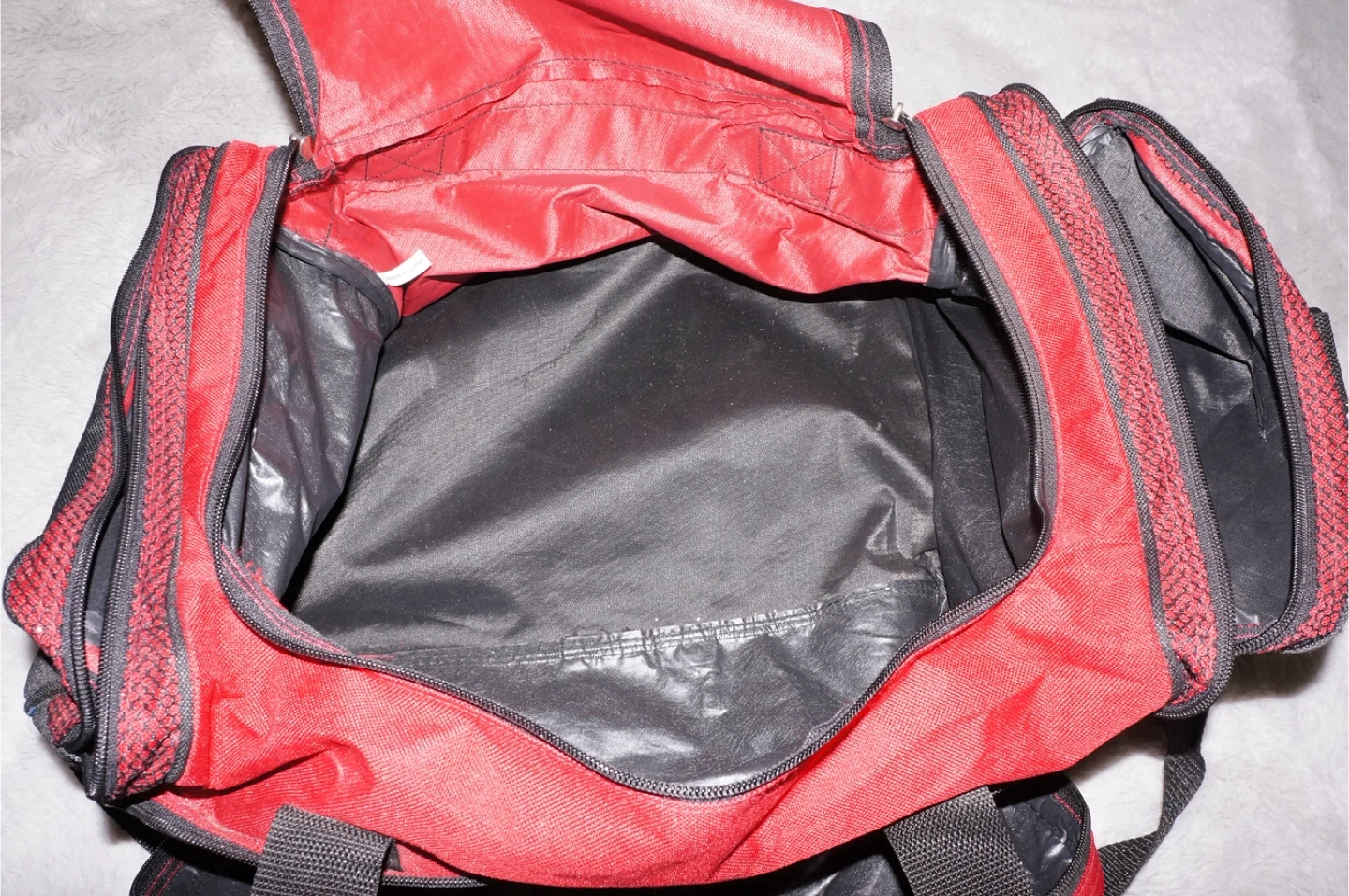 This is a red and black duffel bag with multiple zippered compartments. It features a main compartment and additional pockets for organization. Constructed from durable fabric.